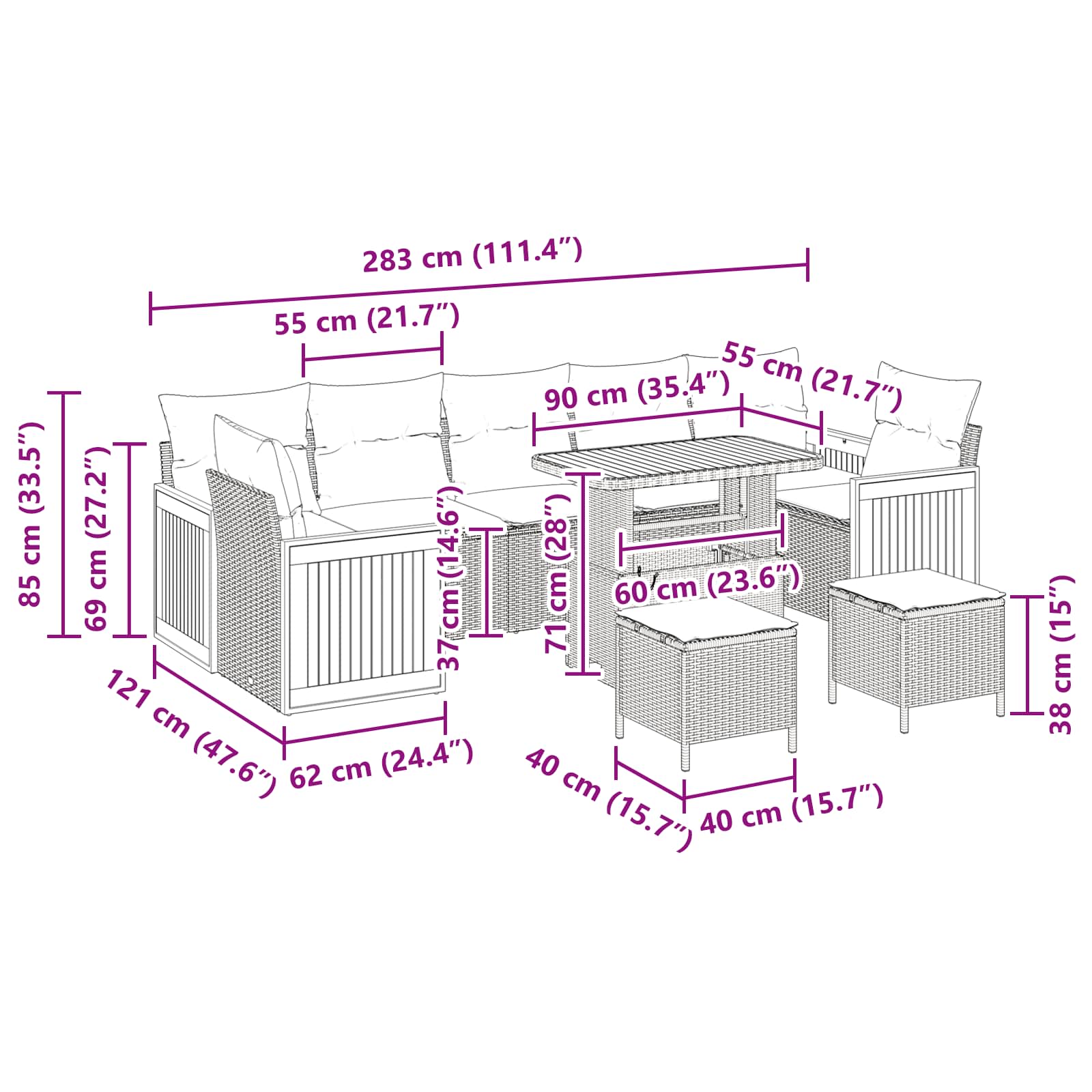 - Caracteristici / Funcționalitate / Design: Materialele rezistente la UV fac ca setul să reziste la soare fără să se decoloreze, iar natura lui modulară permite aranjamente ușoare pentru diferite ocazii. Ușor de mutat, ideal pentru spații dinamice de afară.