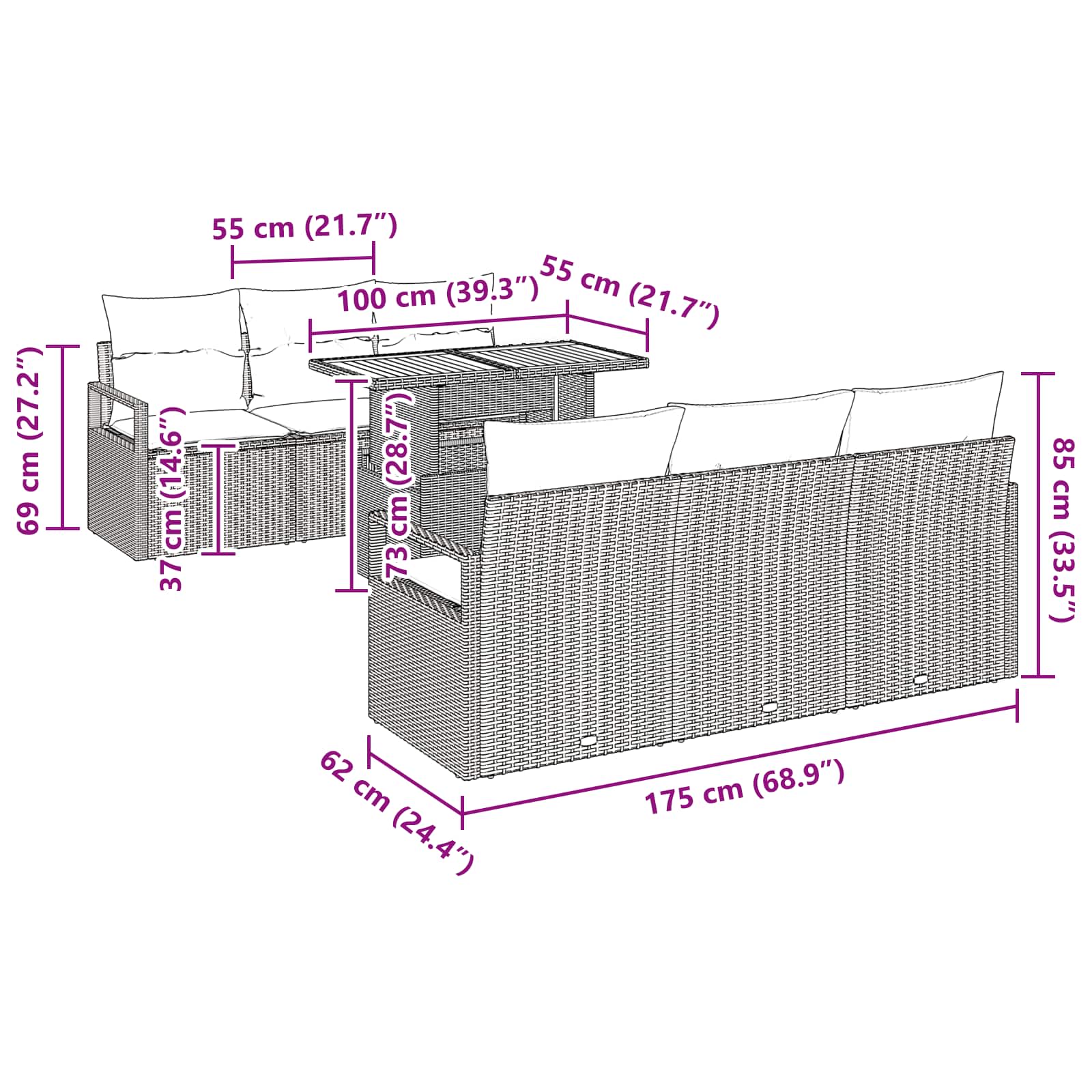 - Componente Complete: Setul include patru canapele cu brațe, două locuri centrale și o masă de grădină, toate având opțiuni de depozitare foarte practice. Canapele și locurile centrale vin cu perne pentru confort, iar masa se potrivește perfect ca punct central în adunări.