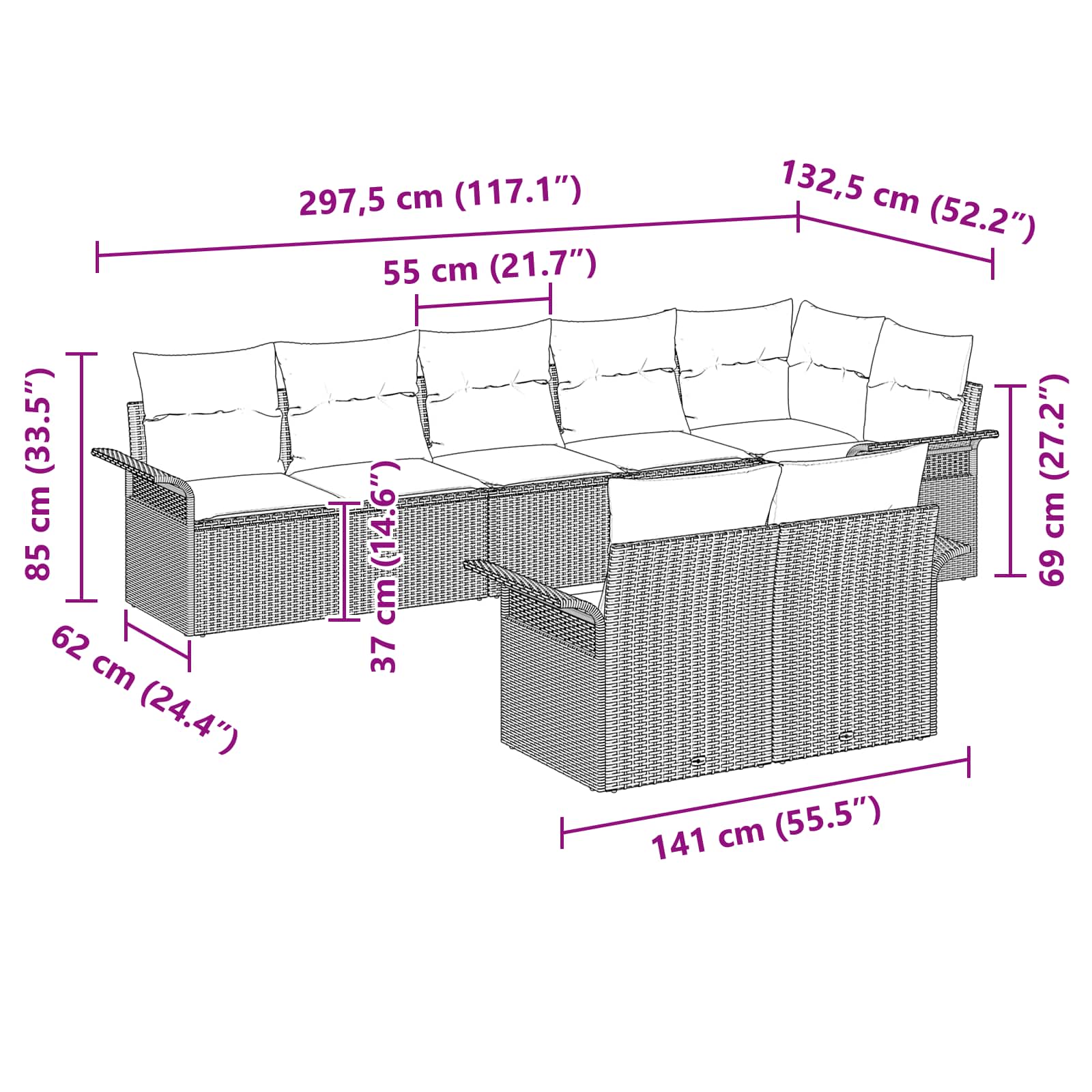 - 4 x canapea cu brațe: 62 x 55 x 69 cm (LxWxH)