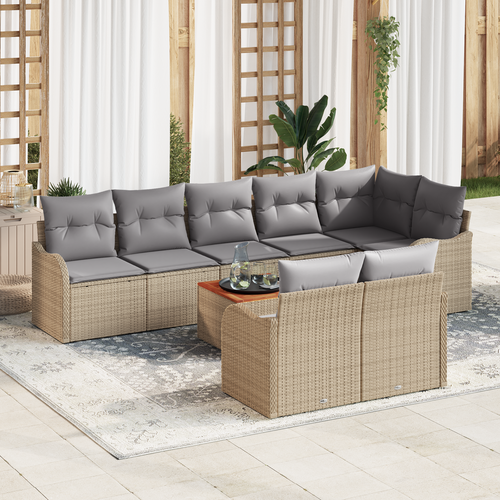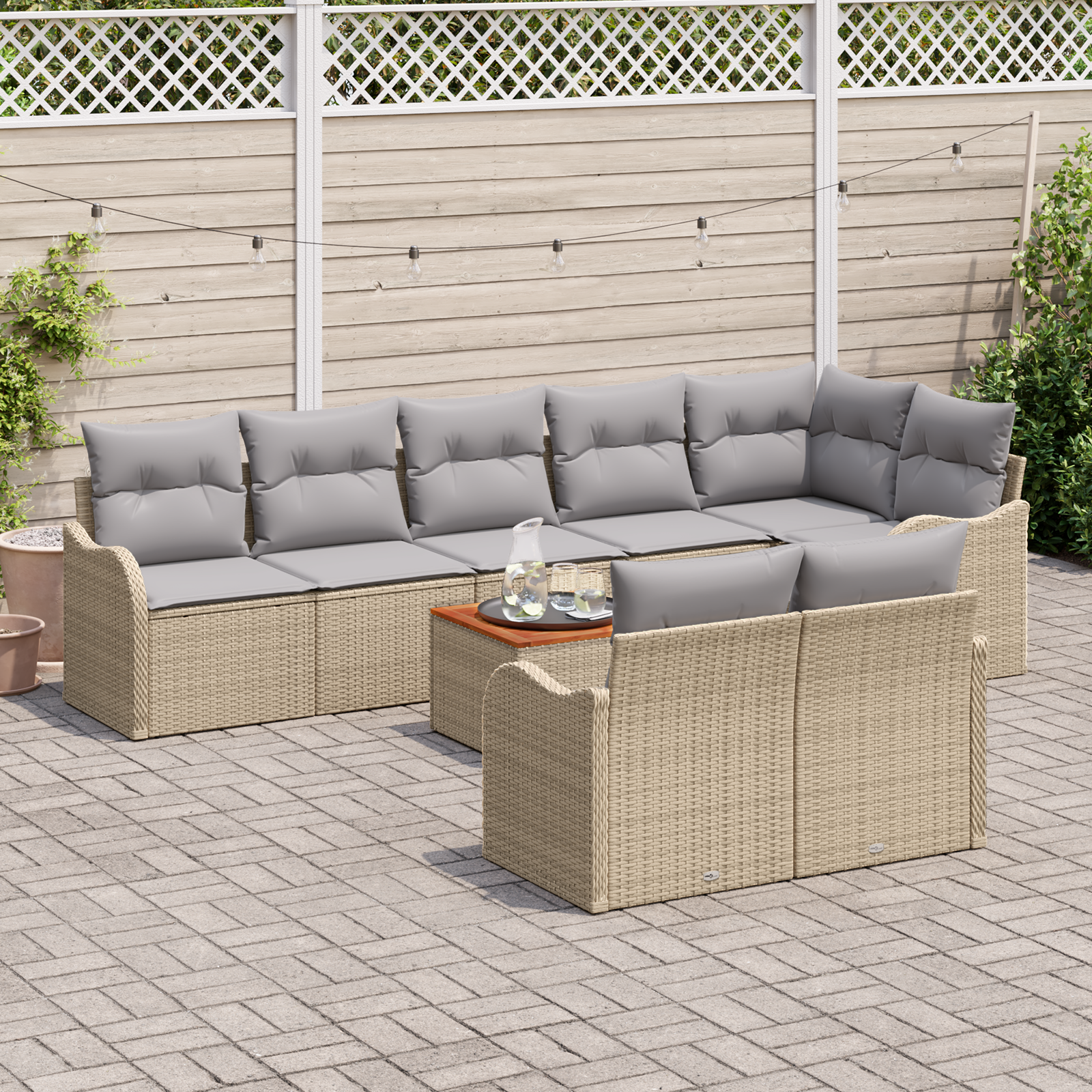 Setul de canapele pentru grădină cu 9 piese e tot despre viața modernă în aer liber, cu un design elegant care e perfect pentru relaxare sau distracție. Făcut din ratan poli împletit manual și lemn masiv, e o alegere stilată, dar robustă pentru patio-ul sau balconul tău, oferind o atmosferă caldă pentru întâlniri sau seri liniștite afară.