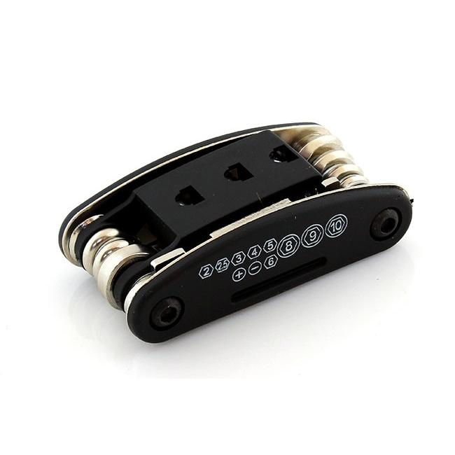 Un set de chei pentru biciclete! Un gadget foarte practic și care economisește spațiu pentru fiecare ciclist avid. De acum înainte, veți efectua orice reparație minoră a bicicletei pe drum, fără a purta o duzină de instrumente separate! Setul include 16 instrumente pentru întreținerea și reparațiile minore ale bicicletei. Totul este închis într-un cuțit de buzunar la îndemână și compact. Când este pliat, se potrivește cu ușurință în mână, este ușor de depozitat și nu ocupă mult spațiu într-un geantă pentru biciclete sau portbagaj. Setul include chei hexagonale, șurubelnițe, prize cu adaptor, precum și chei plate și o cheie specială cu spițe 14GE.