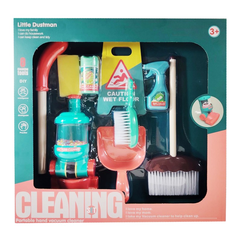 Setul de curatenie pentru copii cu 8 piese este o jucarie educativa si interactiva care ii ajuta pe cei mici sa imite activitatile casnice si sa invete despre importanta curateniei intr-un mod distractiv. Acest set este conceput pentru a stimula responsabilitatea, creativitatea si coordonarea copiilor, oferindu-le un kit complet cu instrumente realiste de curatenie.
