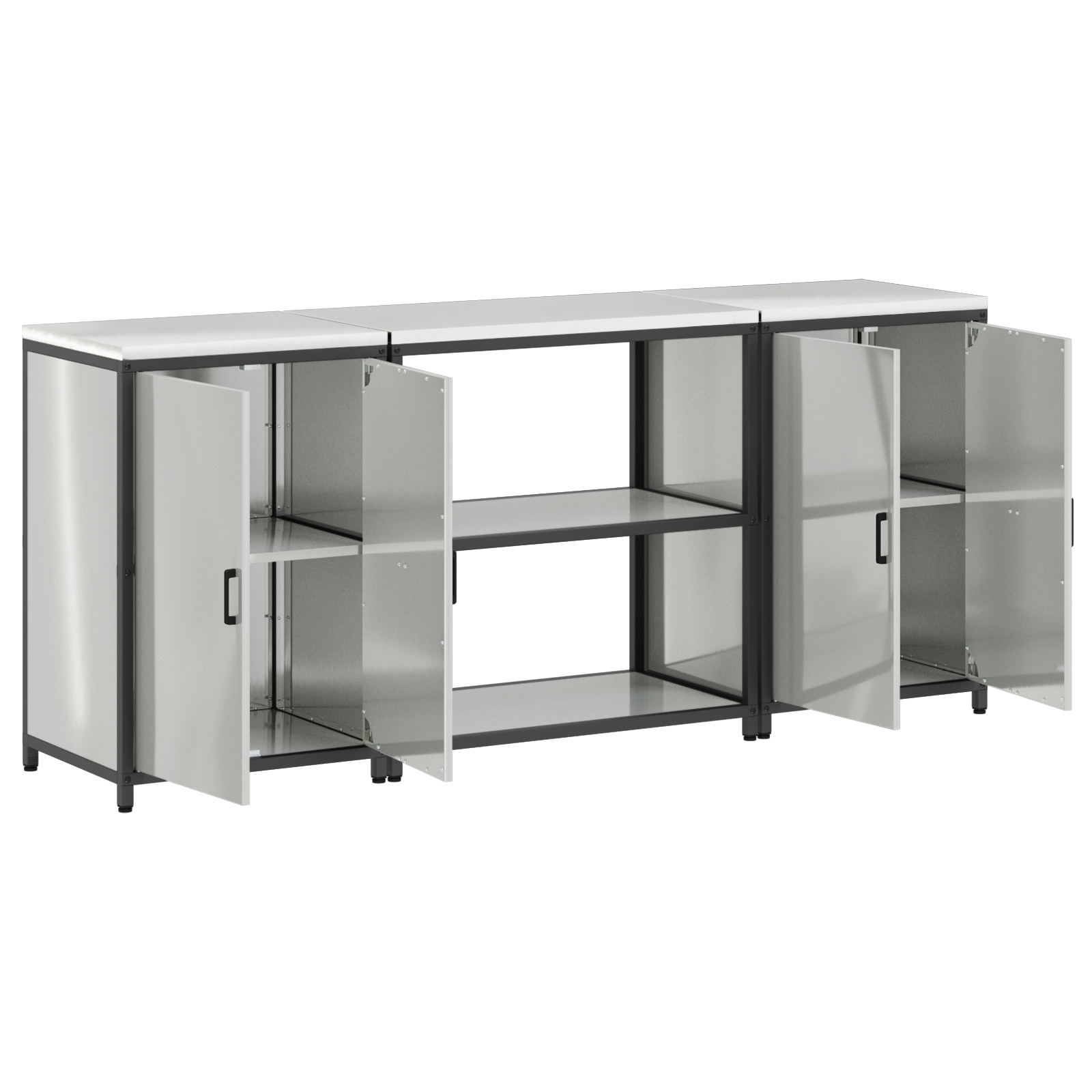 - Componente incluse: Vine cu 1 raft pentru depozitare în bucătărie și 2 cabinete pentru o organizare eficientă. Fiecare secțiune are uși cu balamale solide și bare din aluminiu elegante, combinând utilul cu stilul. Plus, balamalele se deschid ușor, fiind super simple de folosit.