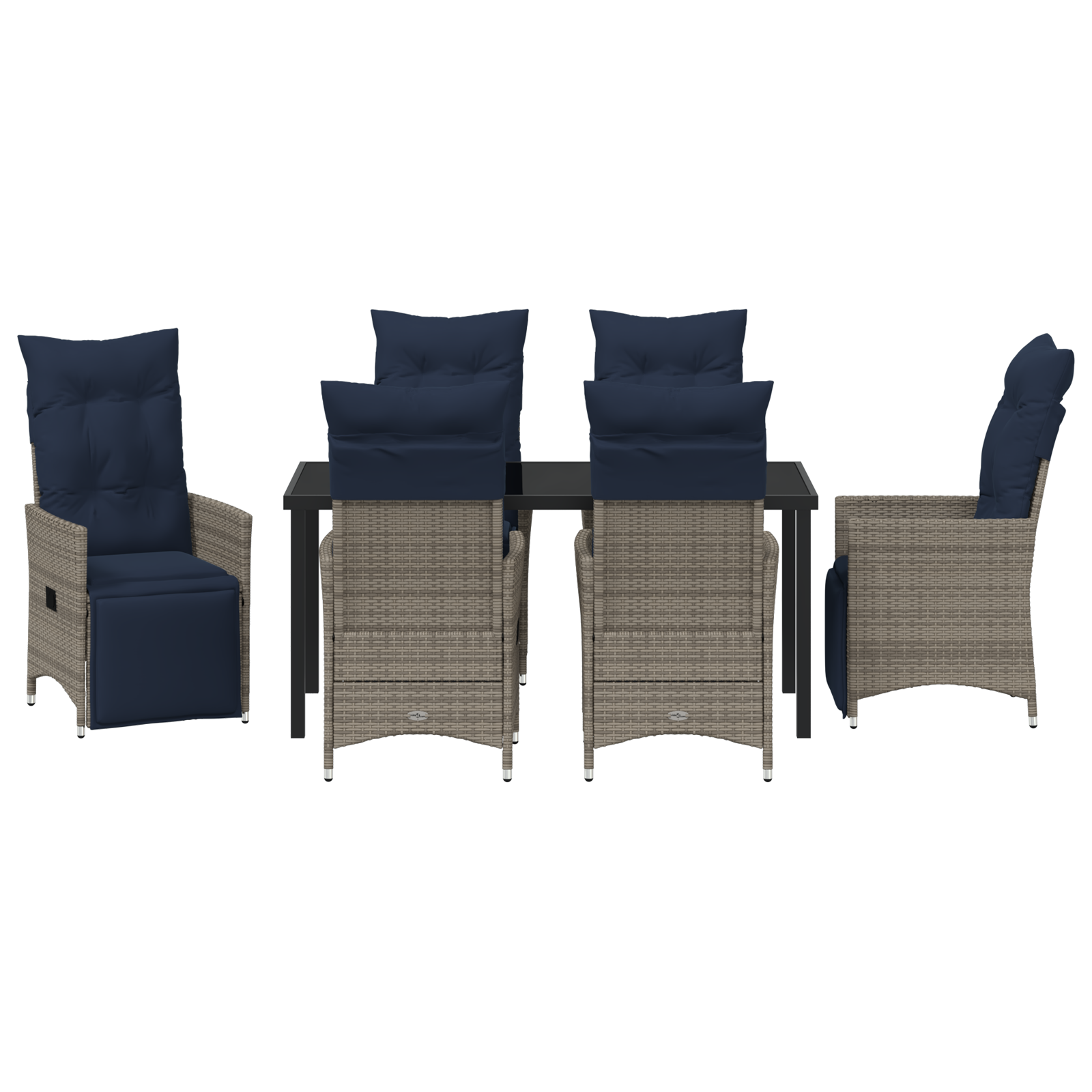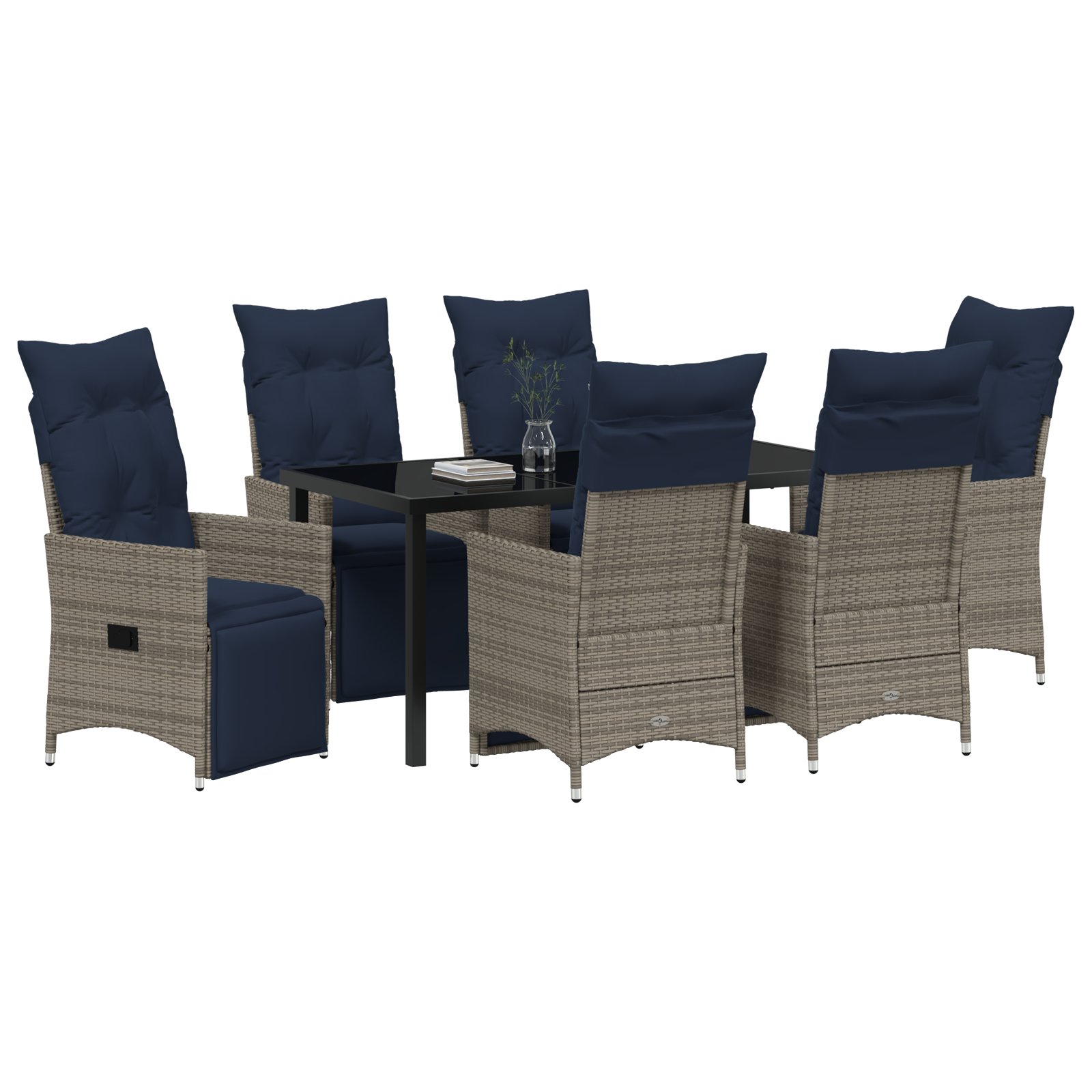 Setul de dining pentru grădină vidaXL are 7 piese și e creat pentru stil și practică, cu un look modern perfect pentru orice întâlnire în aer liber. Vine cu o masă rectangulară robustă și șase scaune confortabile, fiecare având perne inteligente de culoare albastră pentru mese plăcute cu familia și prietenii.