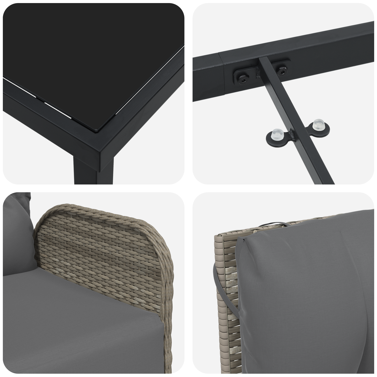 - Aspect stilat: Nuanta trendy de gri și pernele gri închis se potrivesc perfect în orice spațiu exterior, combinând stilul cu confortul fără efort.