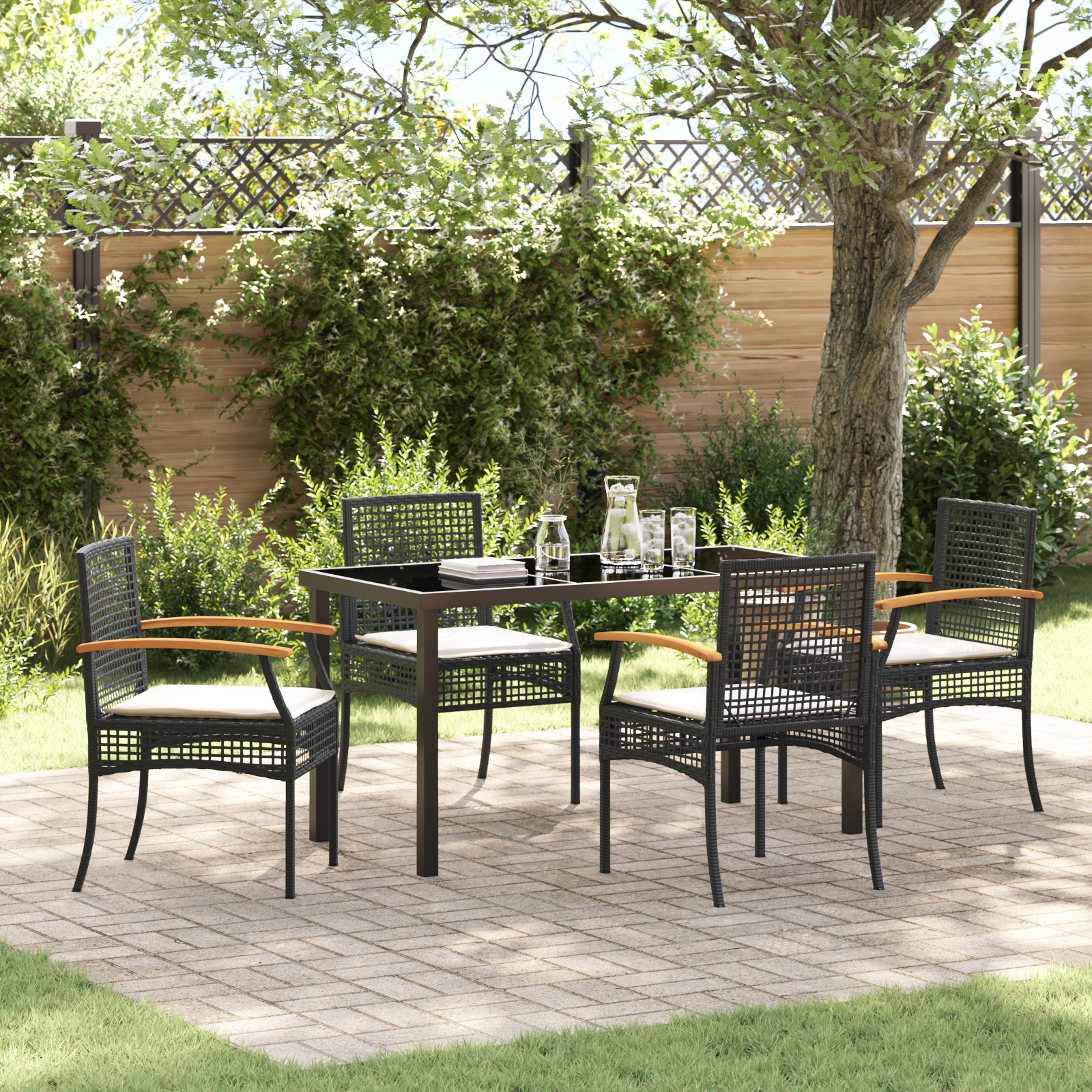 - Atenuarea Naturală: Amestecul de ratan sintetic negru și brațele din lemn de acacia adaugă o notă modernă terasei sau grădinii tale, îmbunătățind aspectul general.
