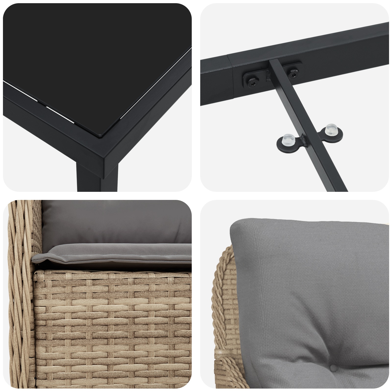- Construire durabilă: Fabricat din poliratan PE, setul ăsta oferă o opțiune care se întreține ușor și rezistă cu brio la intemperii. Materialul sintetic imită ratanul natural și e ușor de curățat, având o durabilitate incredibilă.