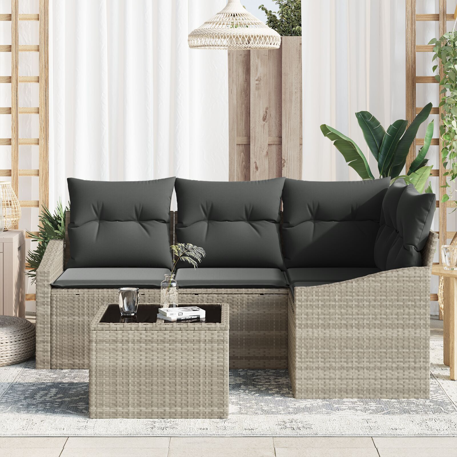 Setul ăsta cu 5 piese are un design fain care combină confortul cu stilul, exact ce-ți trebuie pentru a-ți îmbunătăți spațiul afară. Cu un finisaj grozav din ratan, e locul perfect să te relaxezi, fie că ai musafiri sau vrei să te bucuri de o după-amiază liniștită în grădină sau balcon.