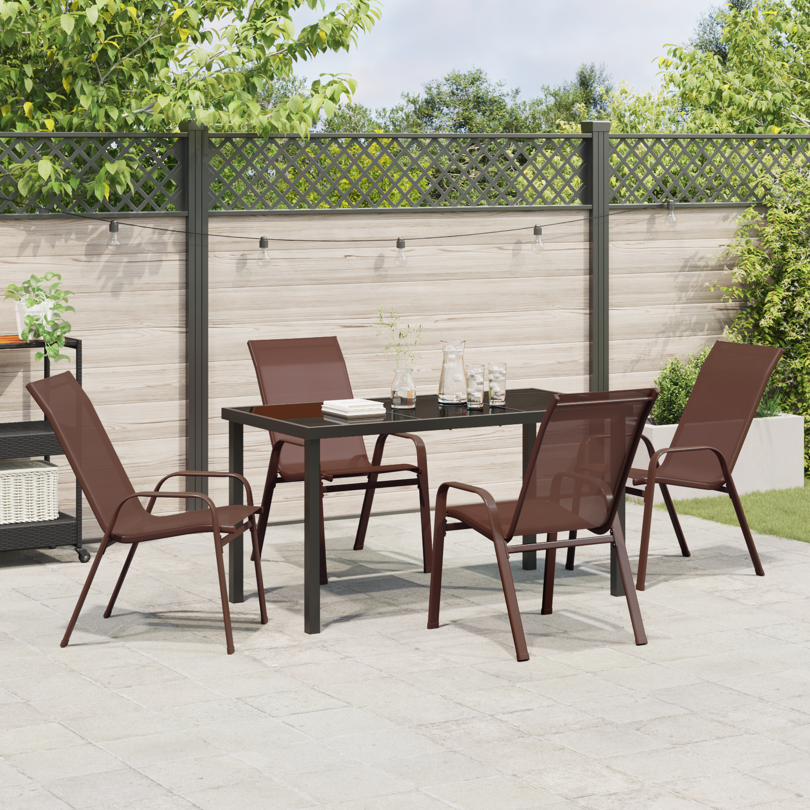 Setul ăsta de dining pentru grădină cu 5 piese îți aduce stilul în aer liber. Are un look modern, din oțel maro cu scaune comfy din plasă, transformând orice spațiu exterior într-un loc ideal pentru mese sau relaxare.