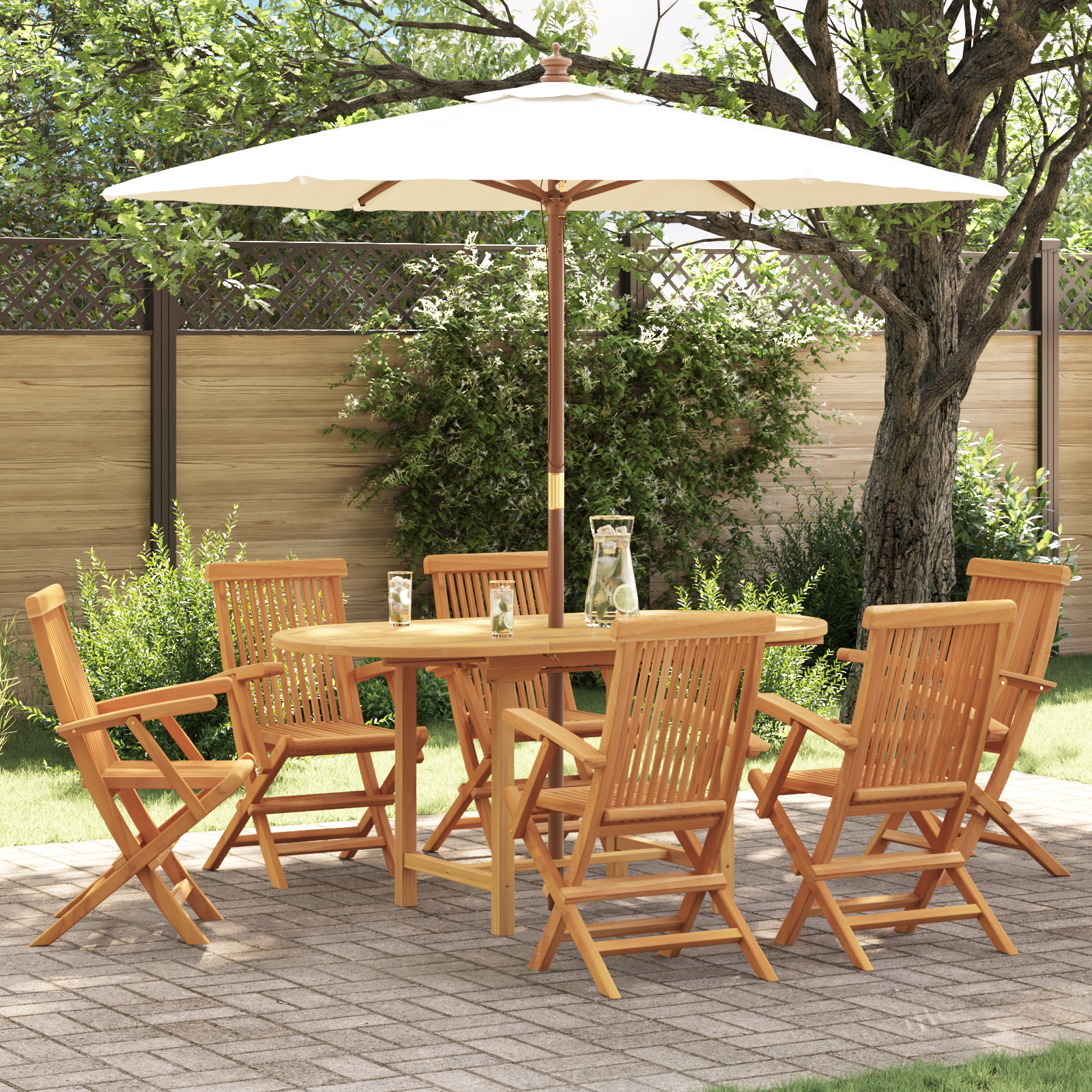Setul ăsta de dining din lemn masiv de tec e alegerea ideală pentru orice spațiu extern, perfect pentru petreceri de vară și mese în familie. Forma ovală și lemnul masiv îl fac nu doar stylish, ci și foarte durabil, oferind locul perfect pentru mese în aer liber.