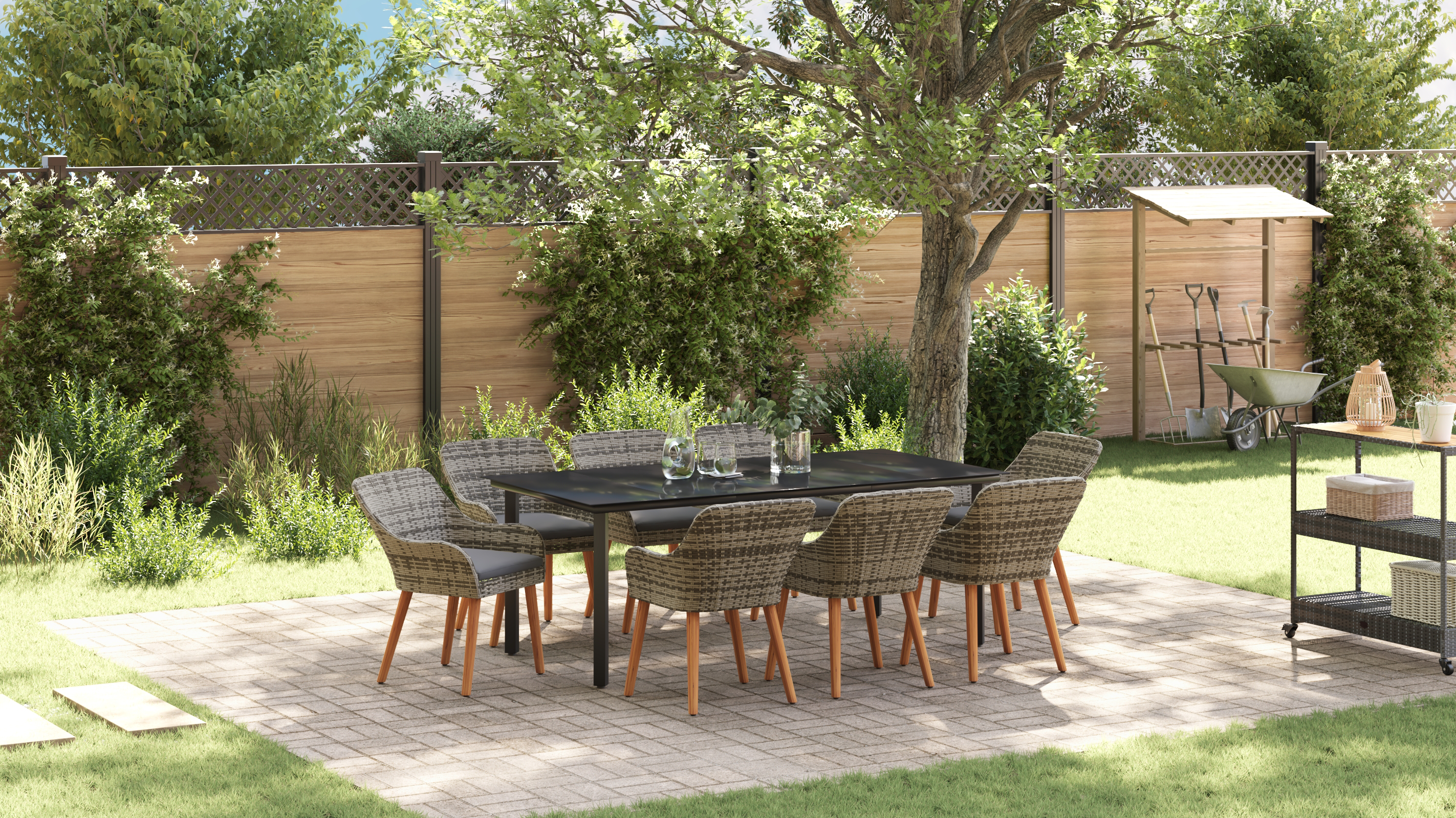 Setul ăsta chic de dining pentru terasă combină stilul modern cu practicitatea, fiind o alegere excelentă pentru mese și distracții în aer liber. Cu o masă dreptunghiulară spațioasă și opt scaune confortabile, transformă balconul sau grădina ta într-un loc fain unde familia și prietenii se reunesc și se bucură de mese împreună.