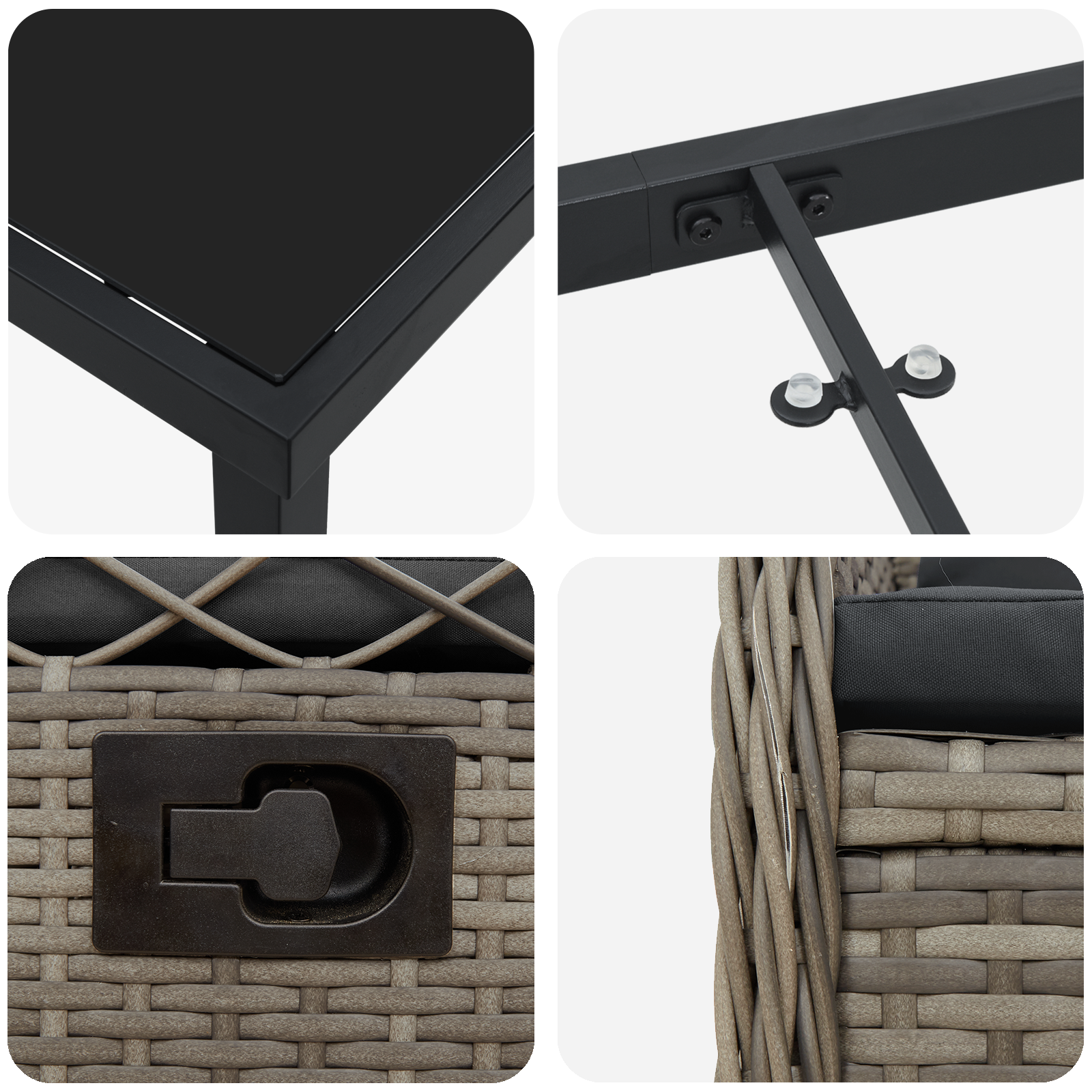 - Făcut din poliratan durabil, rezistent la intemperii, care imită aspectul natural al ratanului și e, în plus, ușor de întreținut.