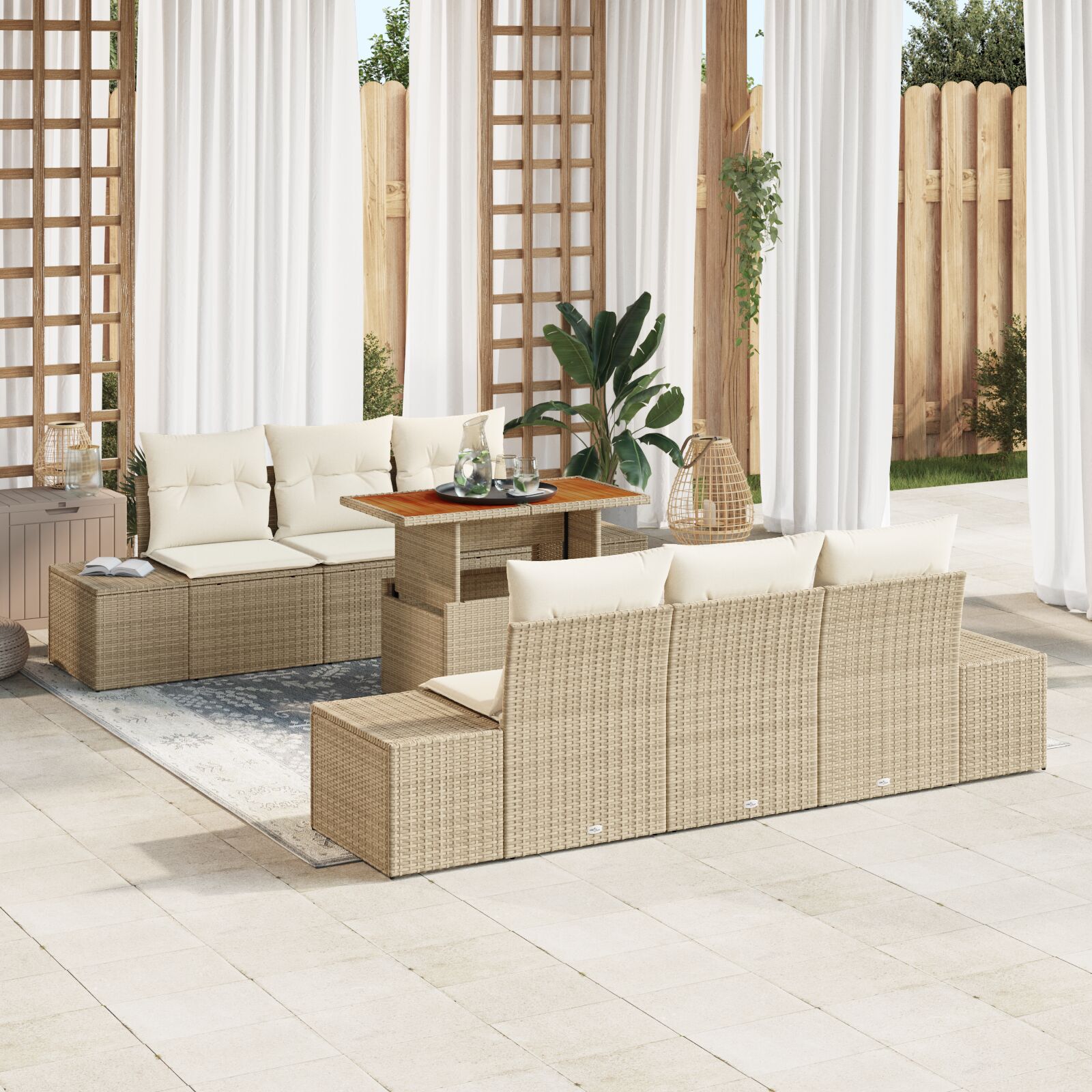 - Aranjament Versatil pentru Exterior: Setul are 4 canapele laterale și 2 scaune centrale, toate cu depozitare integrată pentru a păstra spațiul ordonat.