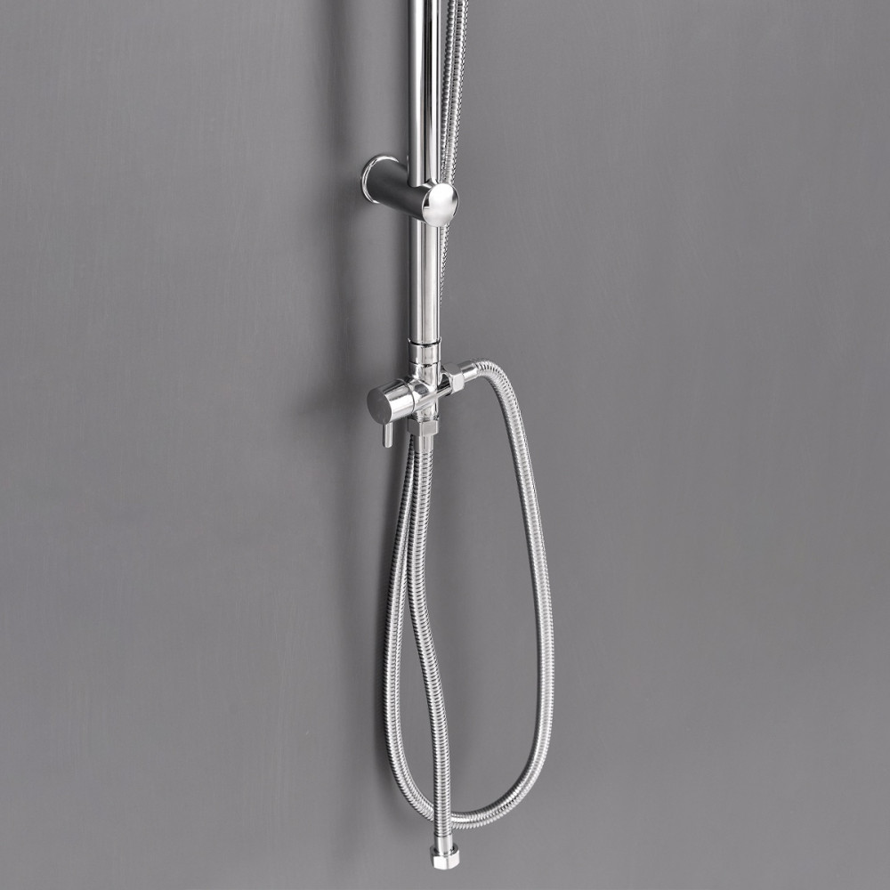 Cu ajutorul comutatorului de funcții (2 poziții) poți trece rapid între aspersorul tropical și dușul de mână. În plus, suporturile de montare sunt reglabile pe înălțime, astfel încât să adaptezi instalarea după spațiul din cabina de duș sau cadă.