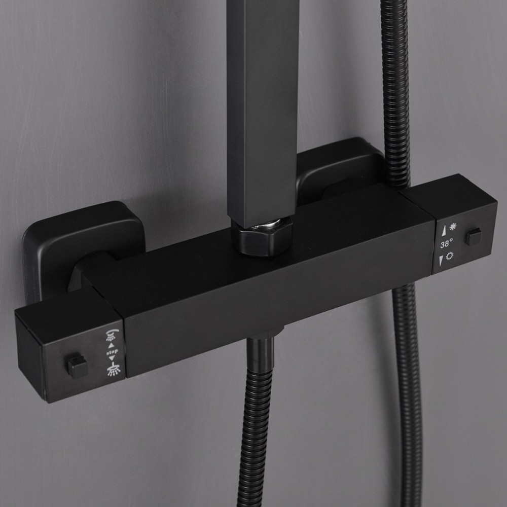 Set de duș Leziter Mazama Black cu baterie termostatică și ploaie tropicală