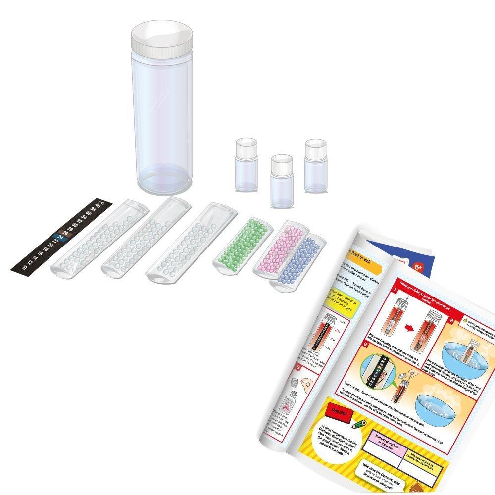 - Continut pachet: brosura educativa in limba engleza, 1 sticla mare, 3 sticle mici, 1 abtibild pentru termometru, 3 pungute cu margele din sticla (40 bucati), 3 pungute cu pietricele colorate