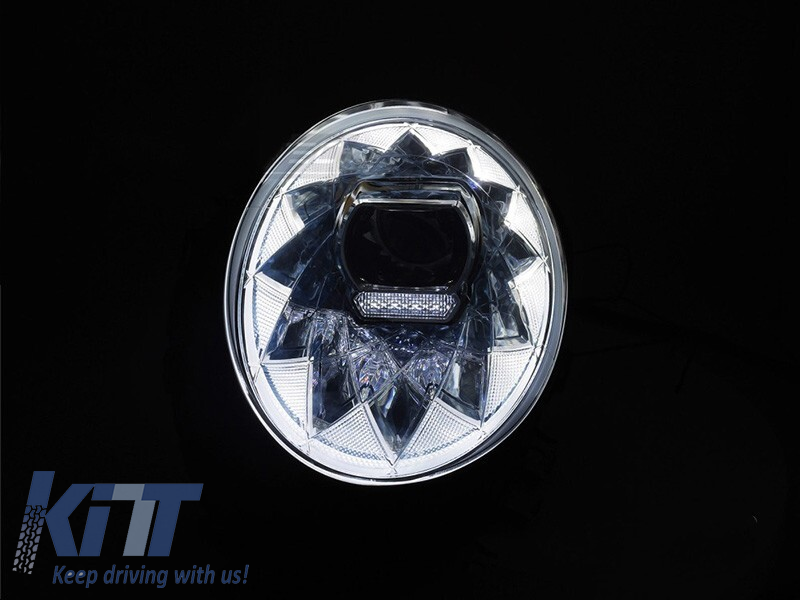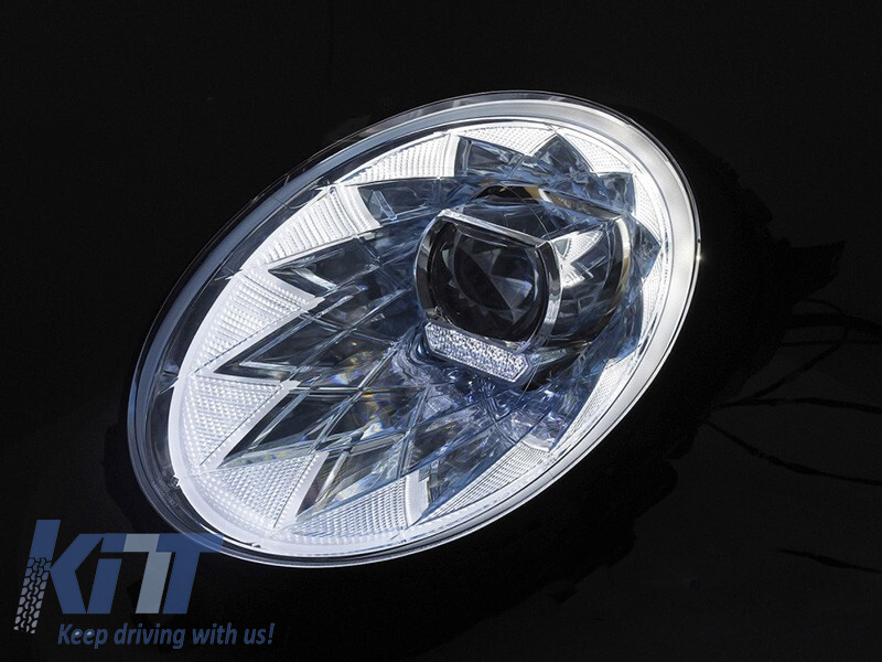 Set de faruri LED de tuning potrivit pentru Mini Cooper F54 Clubman 2015-2019, F55, F56 hatchback 2014-2021 cu bază cromată, pentru modelele cu lumini halogen din fabrică, cu semnale dinamice, cu func Performance AutoTuning