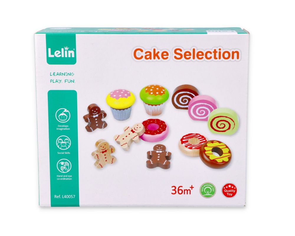 Setul de joaca cu 12 prajituri din lemn Lelin L40057 pentru petrecerea copilului tau. Acum micutul poate coace, vinde sau isi poate astepta musafirii cu prajituri, formandu-si usor abilitatile de socializare si creativitatea.