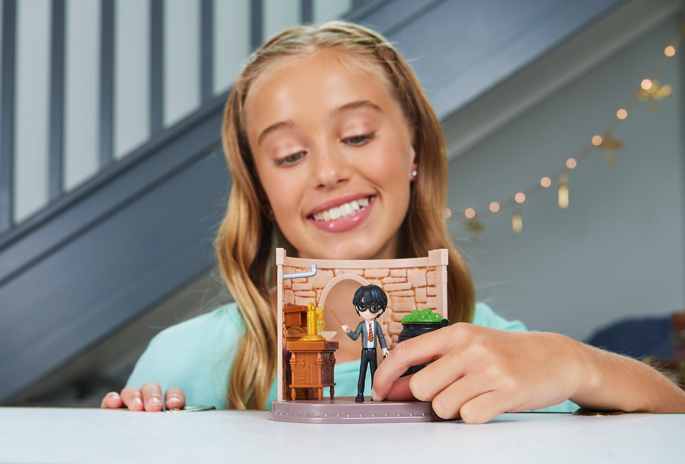 Așază decorul, poziționează figurina Harry Potter în locul de activare și descoperă efectul magic al ceaunului. Folosește accesoriile incluse pentru a recrea lecțiile de poțiuni și pentru a extinde joaca în lumea Hogwarts.