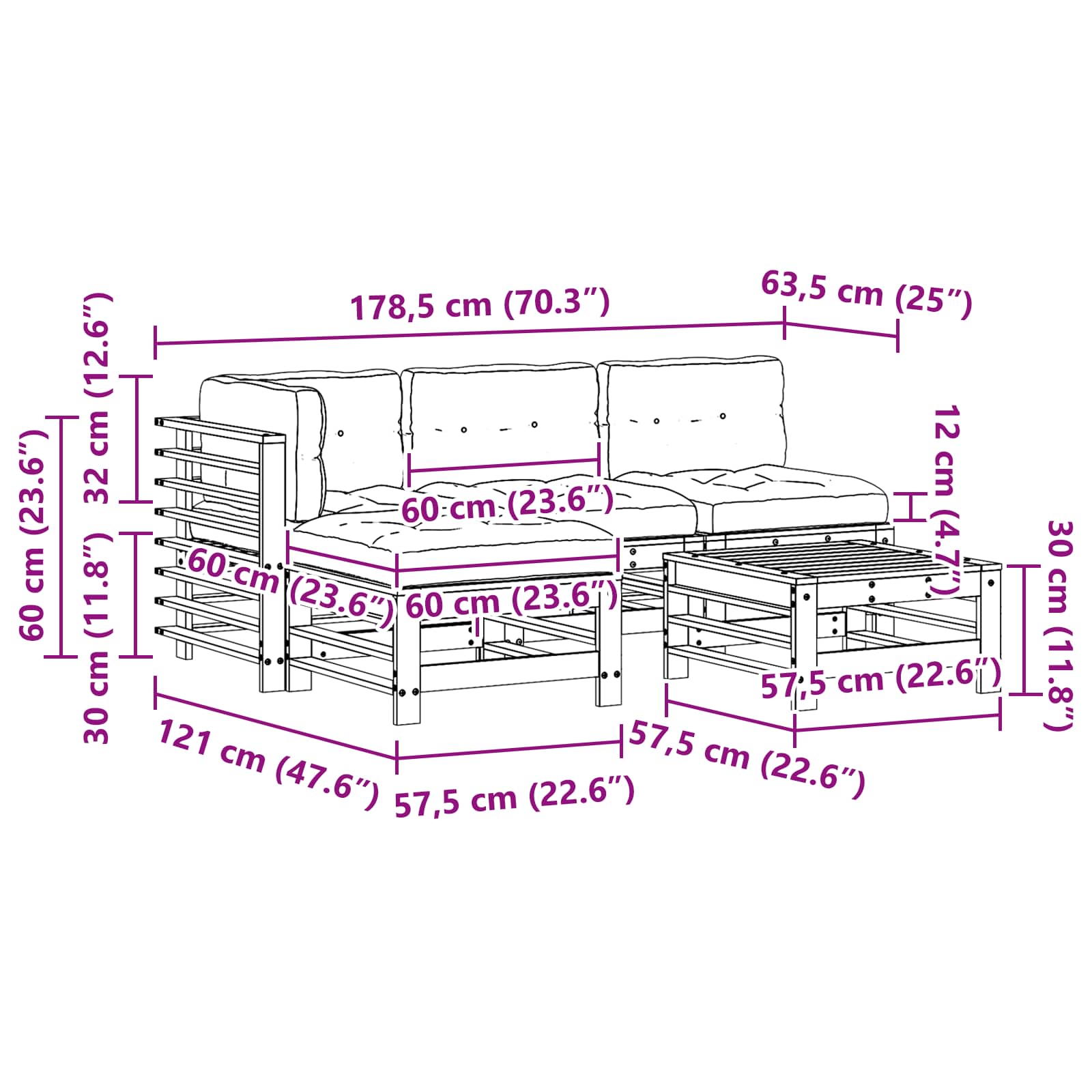 - 4 x Perne de șezut: 60 x 60 x 12 cm(L x l x h)