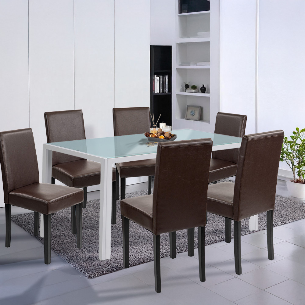Set de masă Leziter Mira cu 6 scaune, masă din sticlă albă, scaune maro