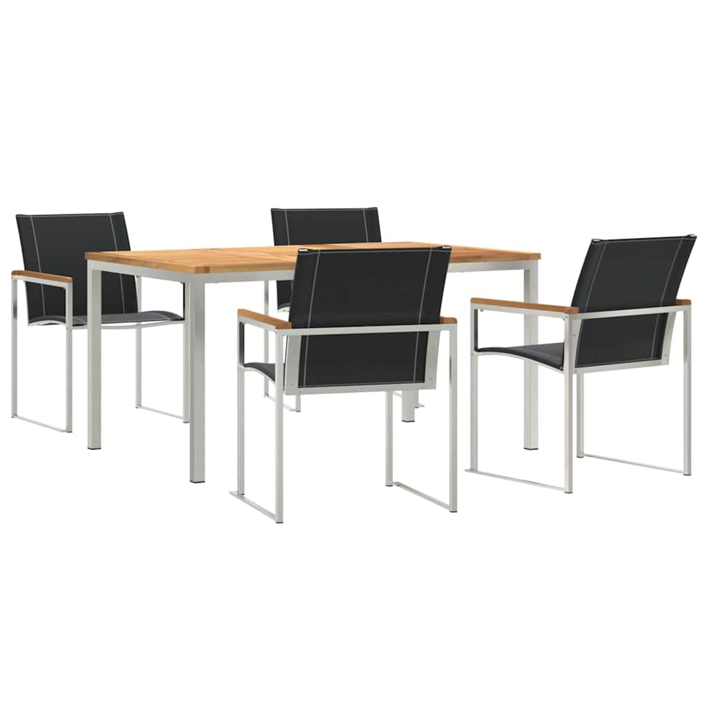 - Materiale: Setul este construit din oțel inoxidabil, făcut să reziste în timp. Cadru din oțel cu un finisaj pulbere care rezistă la vreme, păstrându-se elegant pe termen lung. Scaunele și spătarele din Textilenă sunt alese pentru a fi respirabile și confortabile, ideal pentru utiliza pe perioade mai lungi, îmbunătățind relaxarea afară.