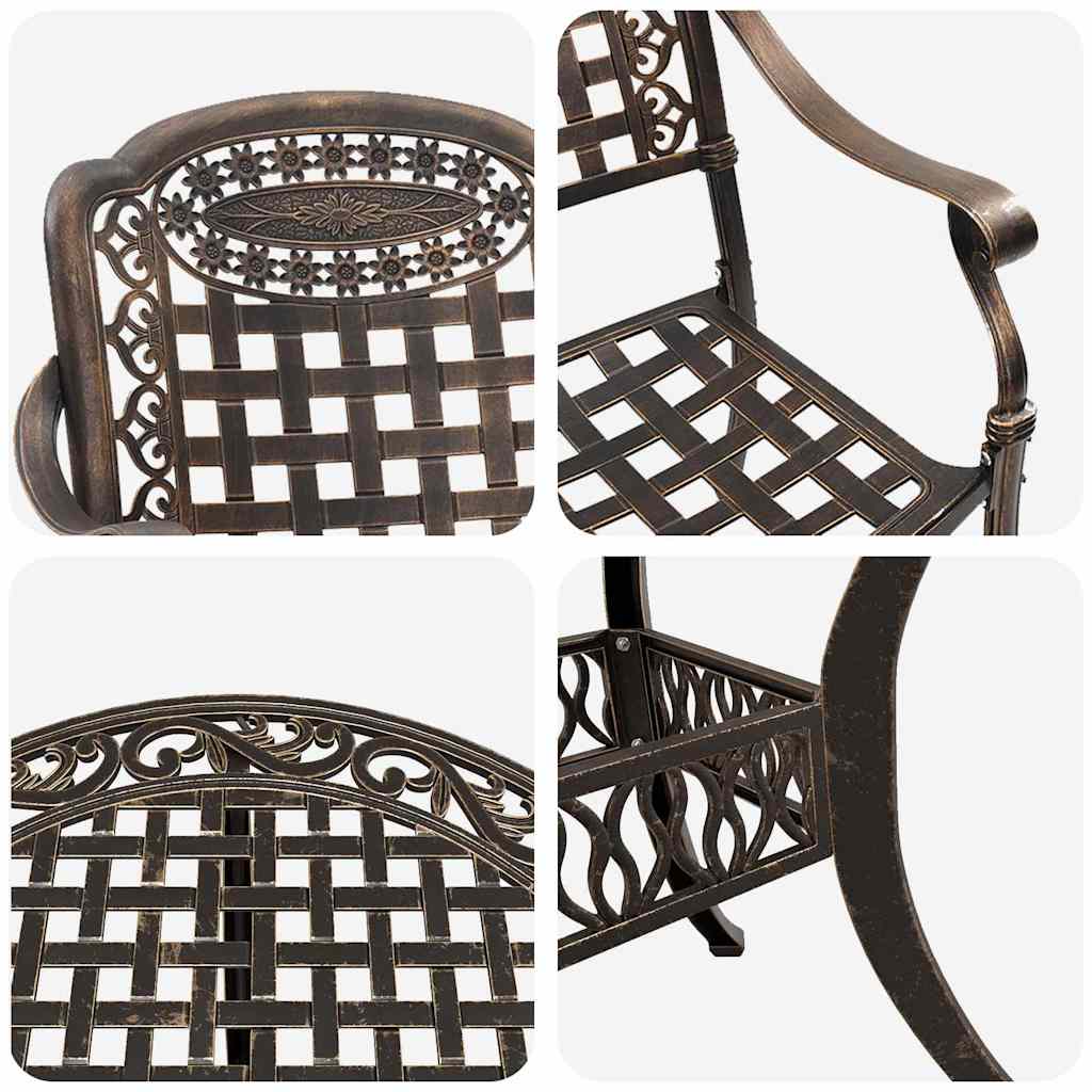 Setul nostru din aluminiu turnat e perfect pentru grădini sau terase. Cu un stil clasic care se potrivește oricărui decor, aduce eleganță și funcționalitate. Construcția din aluminiu nu doar că arată bine, dar și rezistă la vreme. E ideal pentru mese în aer liber, fie casuale, fie formale, pentru cine iubesc să mănânce afară.