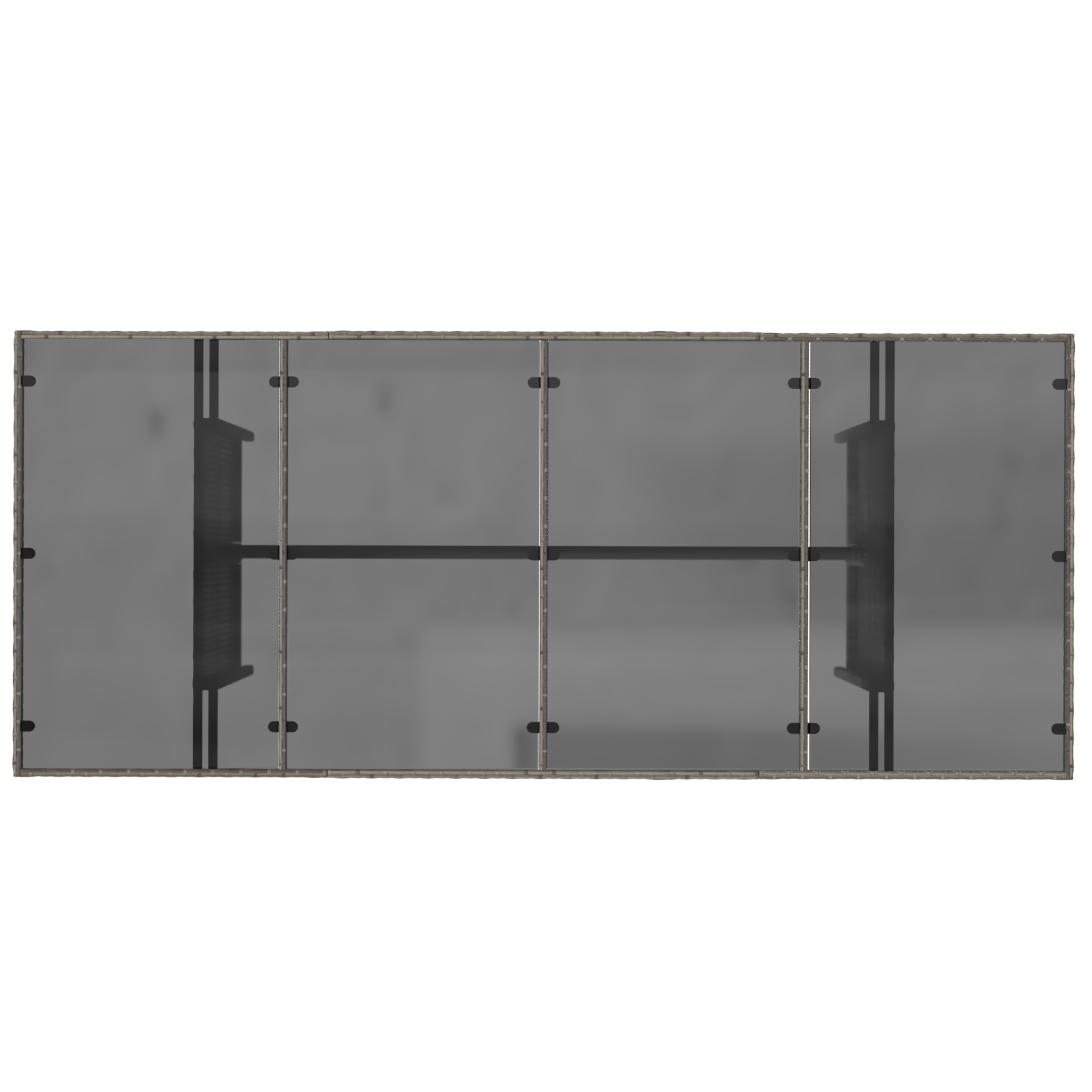Acest set de masă pentru grădină cu 9 piese e perfect pentru orice zonă în aer liber, cum ar fi o terasă, un balcon sau o grădină. Designul său modern din ratan poli gri și blatul din sticlă securizată oferă funcționalitate și vibe cool, fiind ideal pentru adunări sau mese casuale.