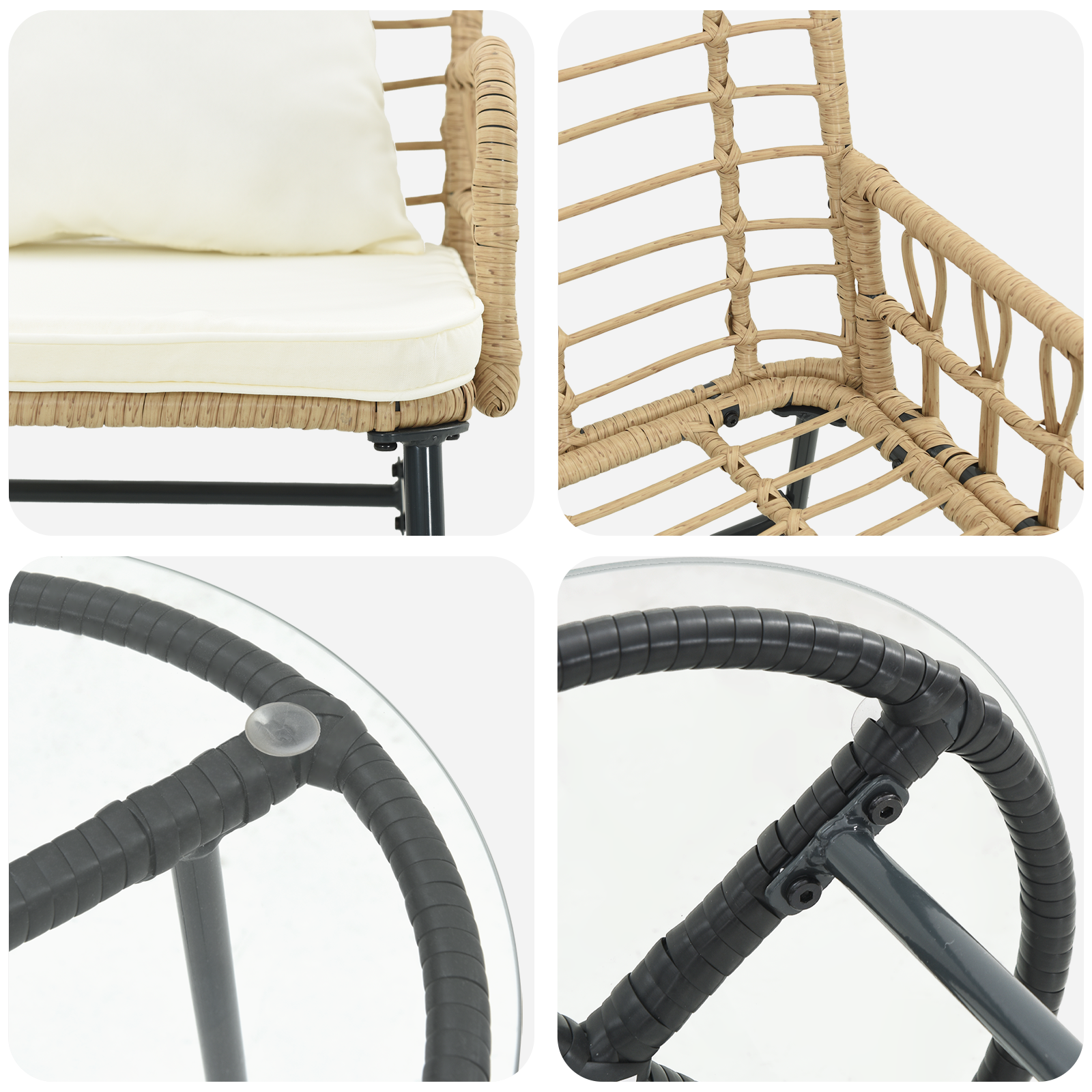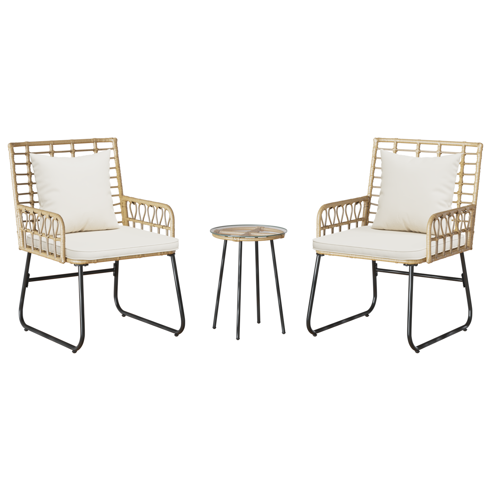 - Materiale: Setul de bănci e făcut din poliratan și oțel, așa că e rezistent și face față vremii. Arată chic și e comfy, iar cadrul din oțel îl menține stabil în timp.
