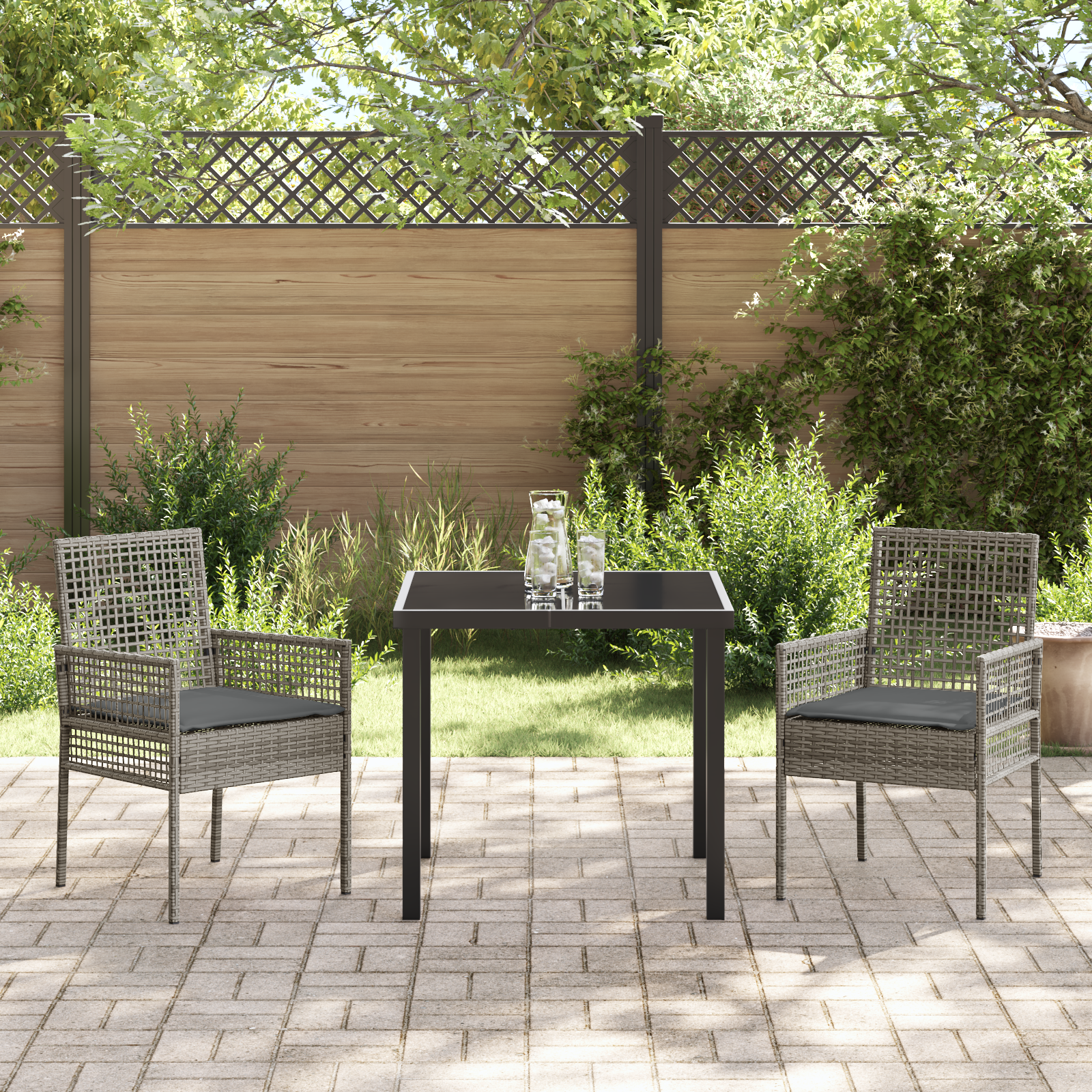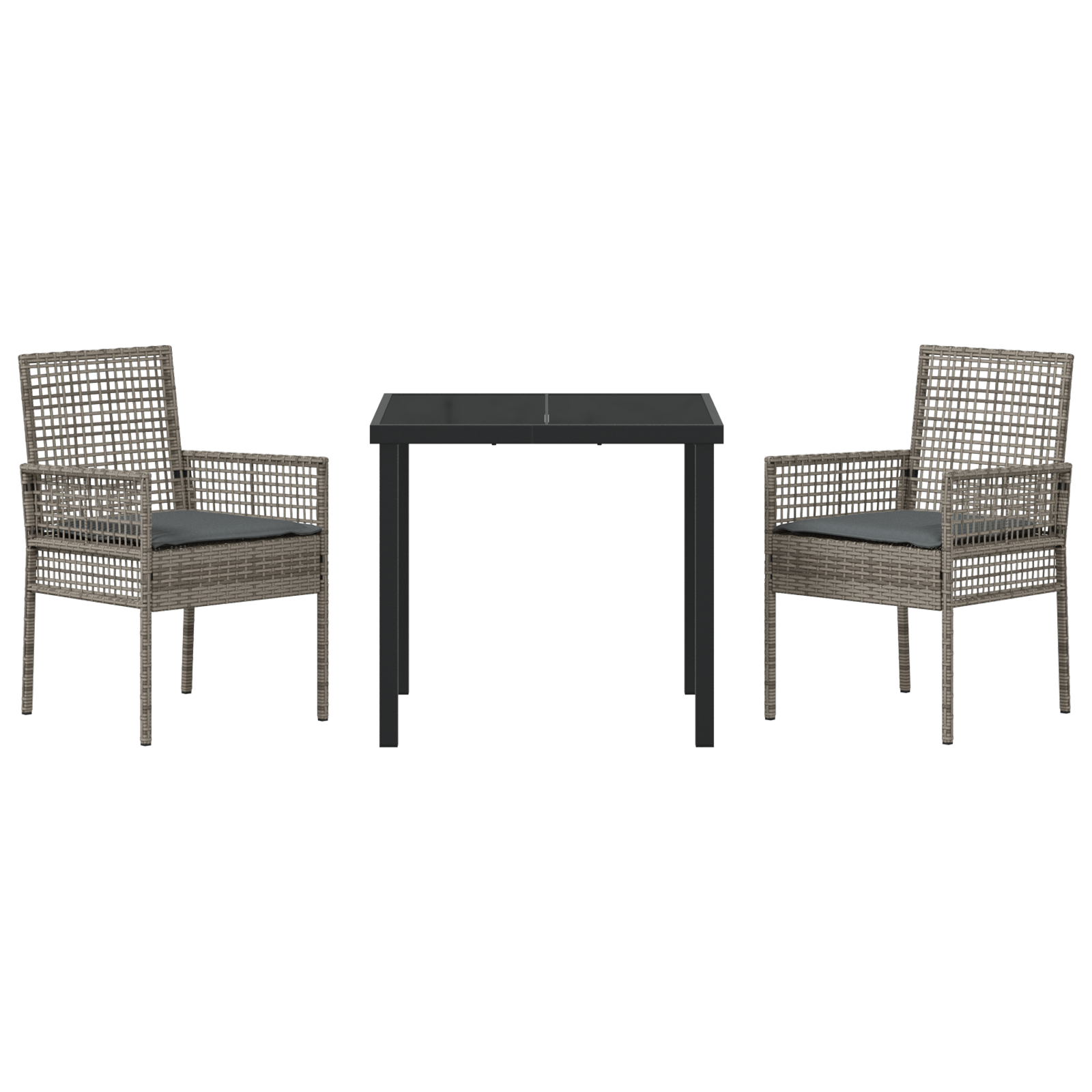 Această masa de grădină are un aspect modern, creat din confort și stil, ideal pentru orice zonă de masă în aer liber. Include două scaune stilate și o masă pătrată, toate în nuanțe de gri și gri închis, care îmbunătățesc ușor balconul sau terasa ta.