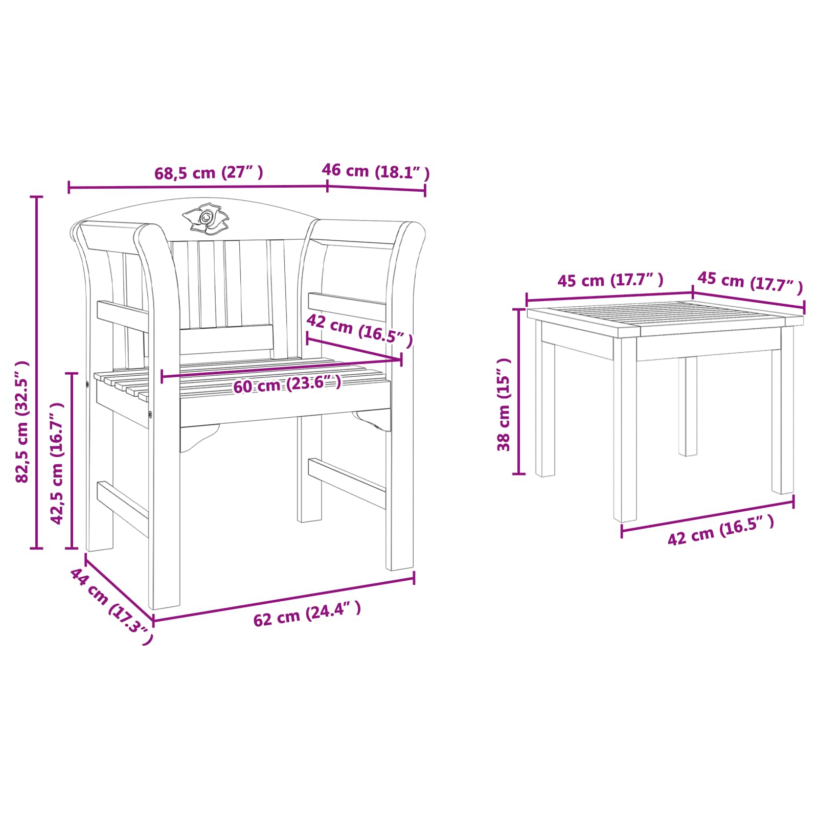 • 1 x scaun roz: 68.5 x 46 x 82.5 cm (L x l x H)
