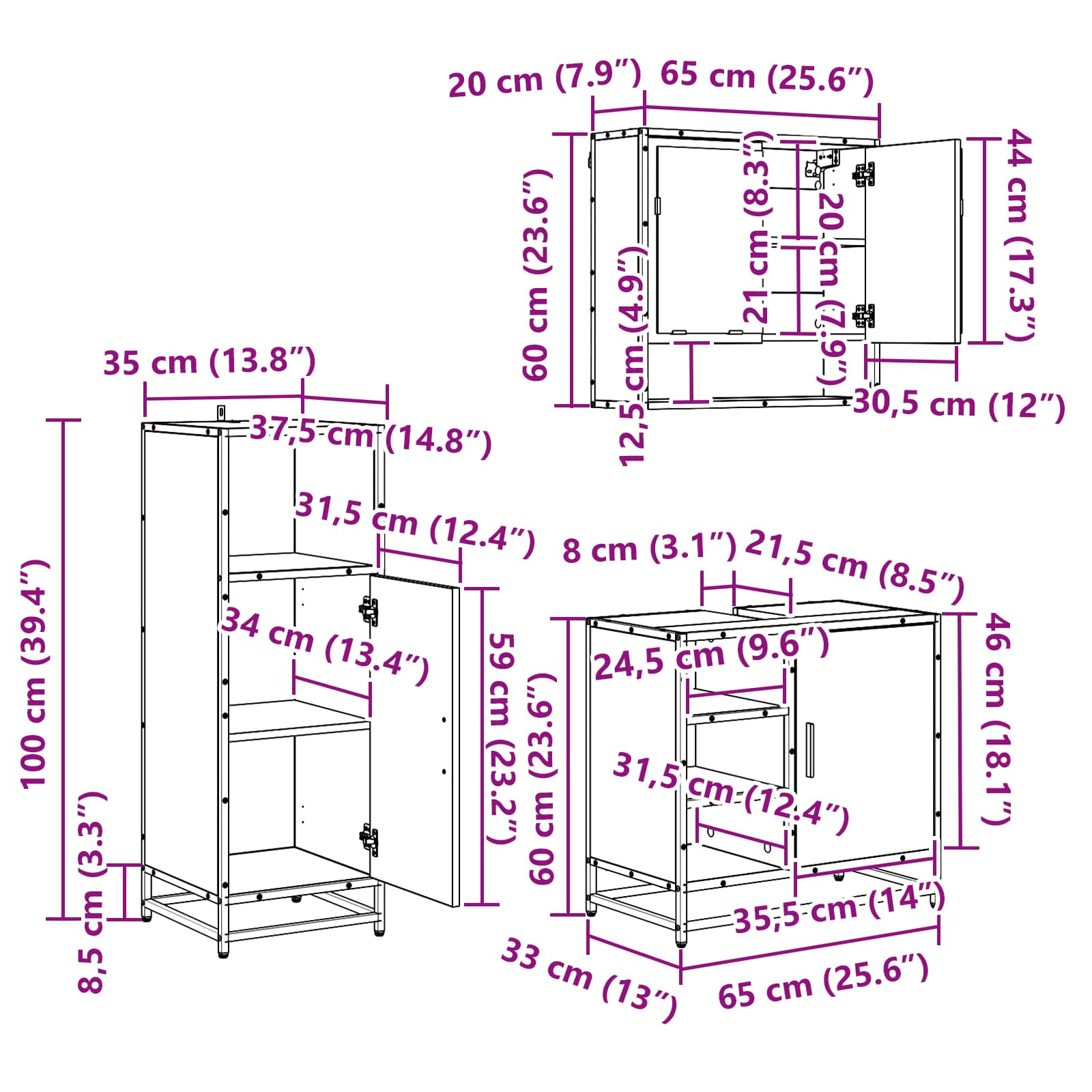 - 1 x Cabinet de baie: 37,5 x 35 x 100 cm (LxWxH)