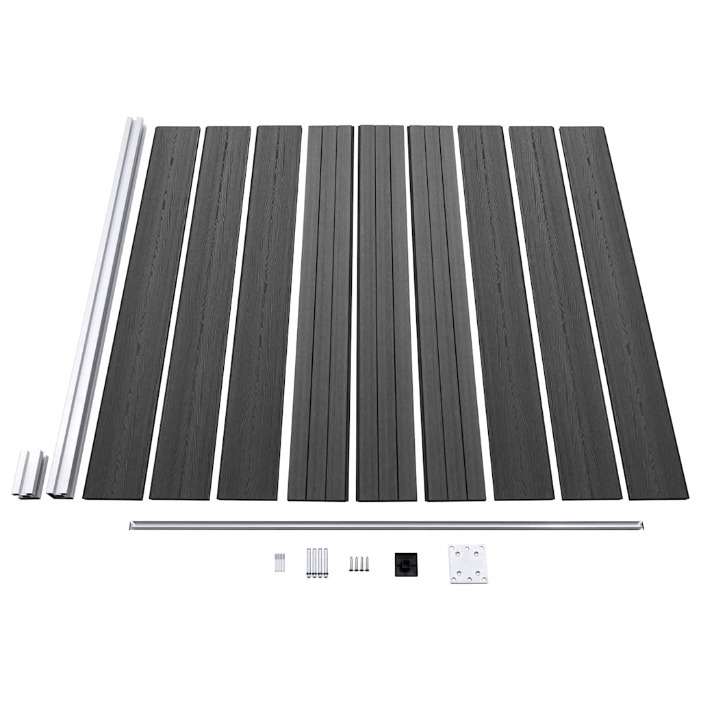 - Material: WPC (compozit lemn-plastic), aluminiu, oțel