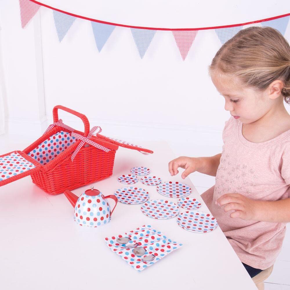 Set de picnic pentru copii cu buline, 19 piese, cos rosu inclus
