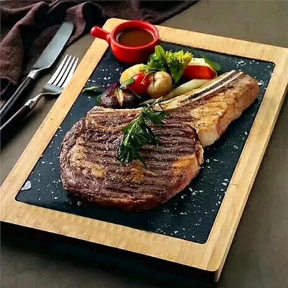 Transformă orice masă într-un moment special cu acest set de servire din ardezie cu suport din lemn de acacia. Contrastul dintre ardezia neagră și fibra caldă a acaciei oferă un look premium, ideal pentru platouri de brânzeturi, aperitive, sushi, steak sau deserturi.
