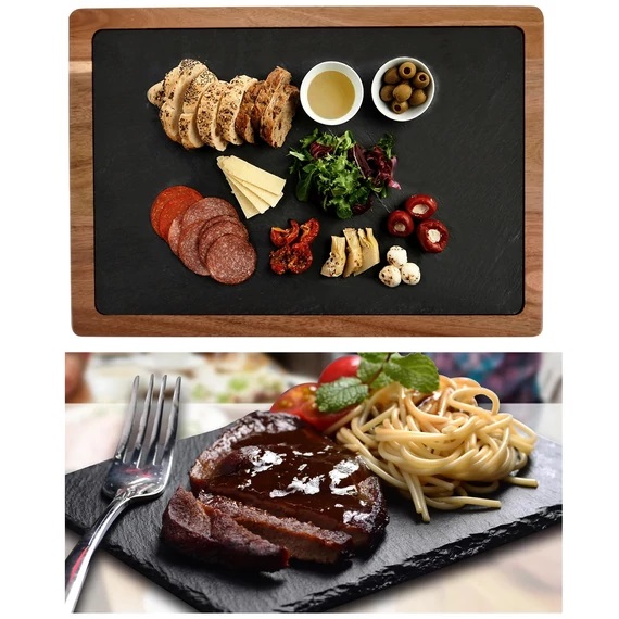 Set de servire din ardezie naturală cu suport din lemn de acacia, 33 x 23 cm