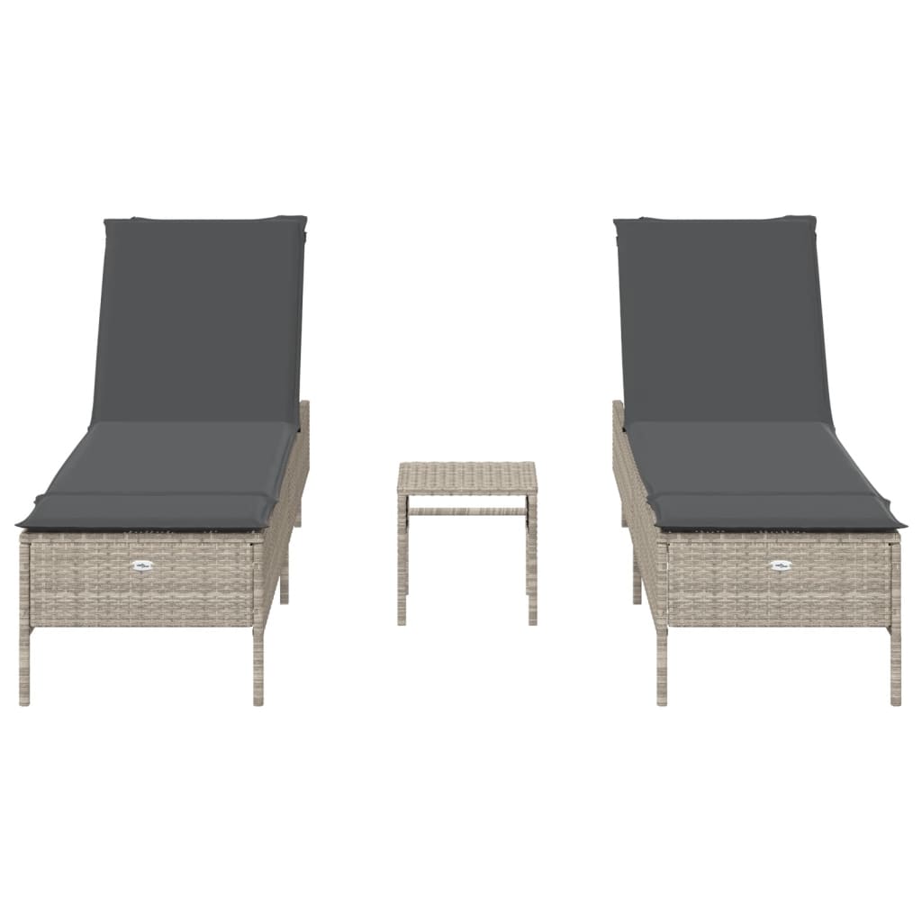 Set de șezlonguri, 3 piese, cu pernă, poliratan gri deschis GartenMobel Dekor