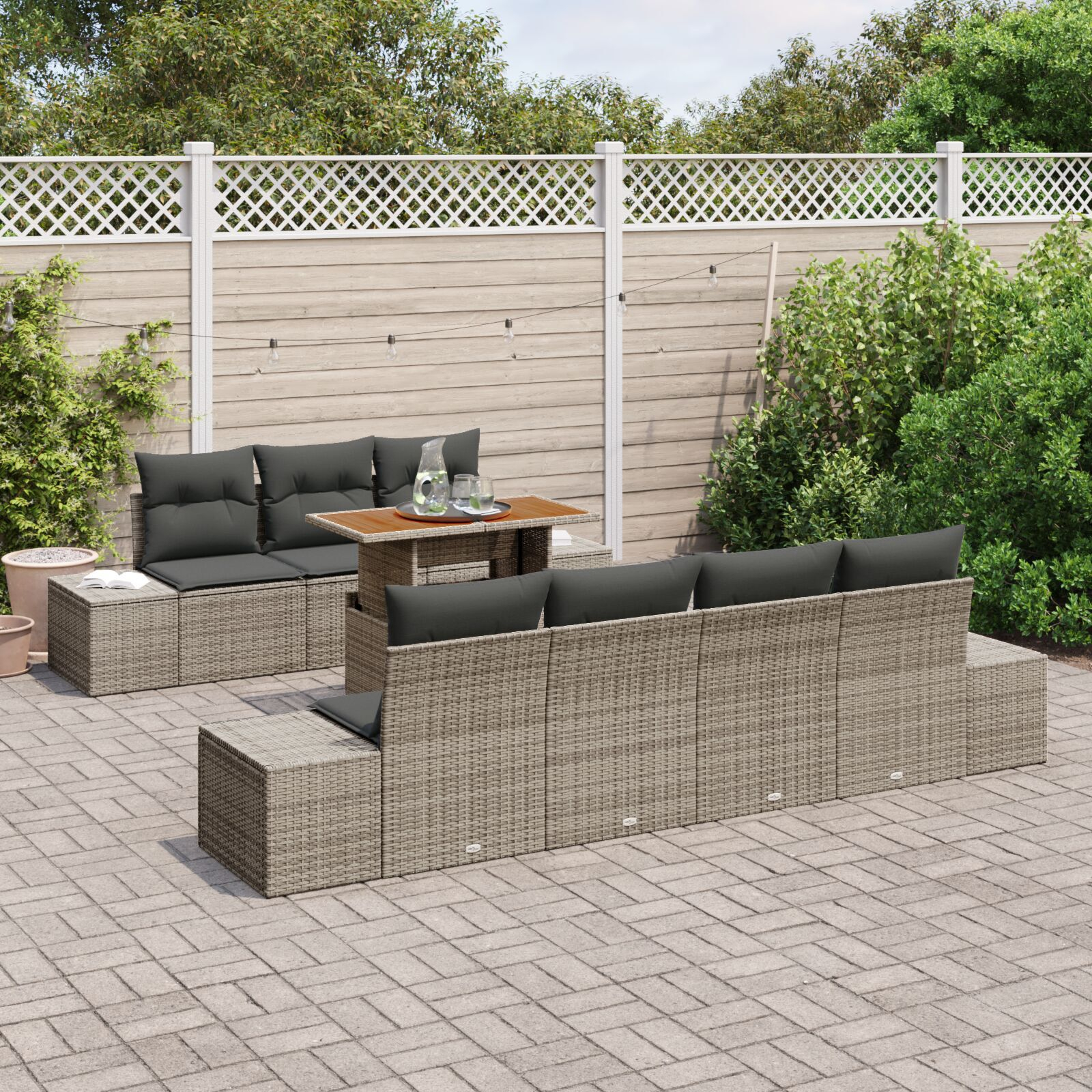 - Conținutul Livrării: 4 x Sofa laterale cu depozitare și saci impermeabili, 3 x Scaune centrale cu depozitare și saci impermeabili, 1 x Masă de grădină