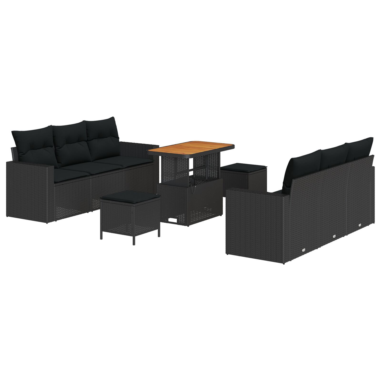 Set de Sofa pentru Grădină cu 9 Piese cu Perne Negru Poli Ratan Acacia, Set de Dining pentru Grădină cu 3 Piese cu Perne Negru Poli Ratan Acacia GartenMobel Dekor