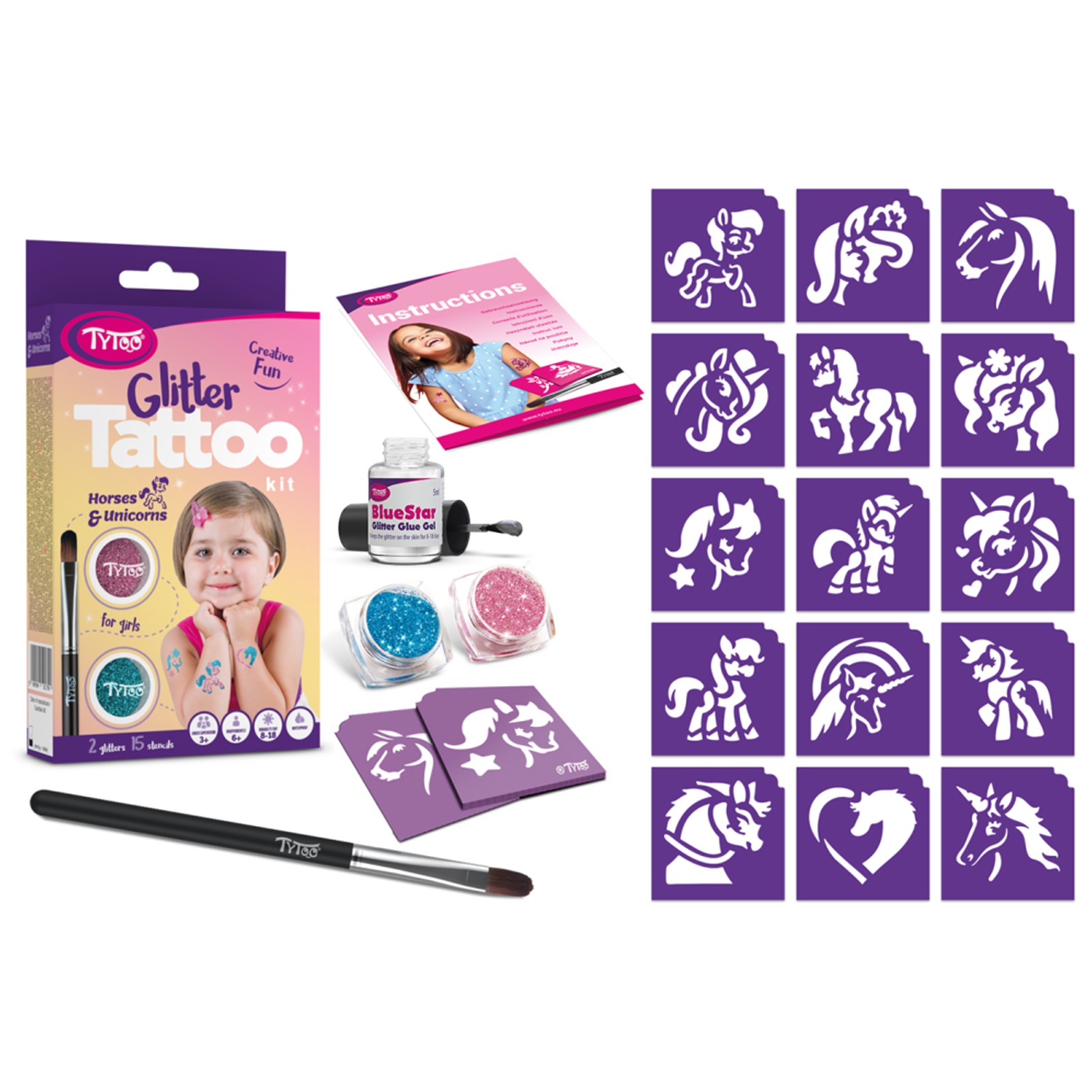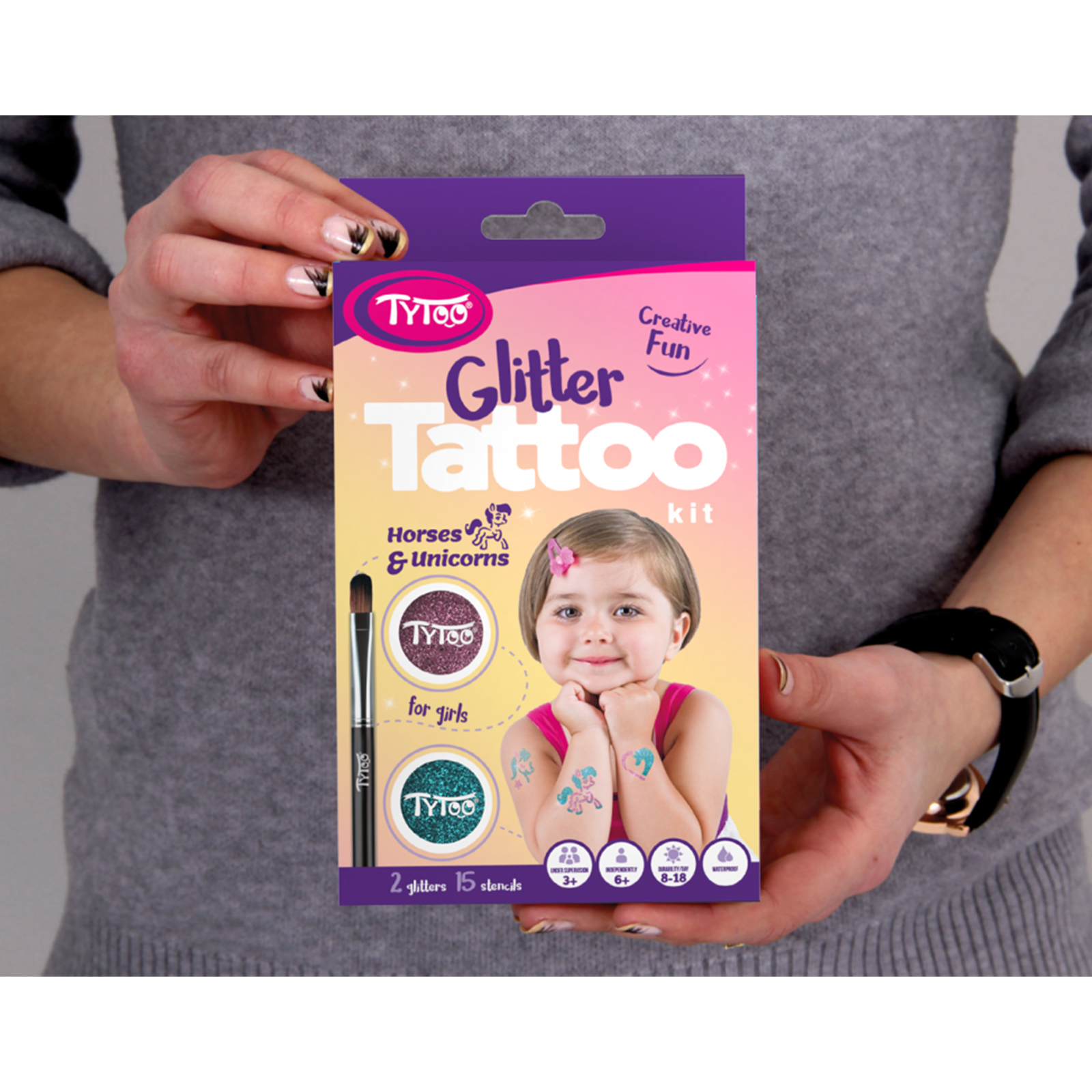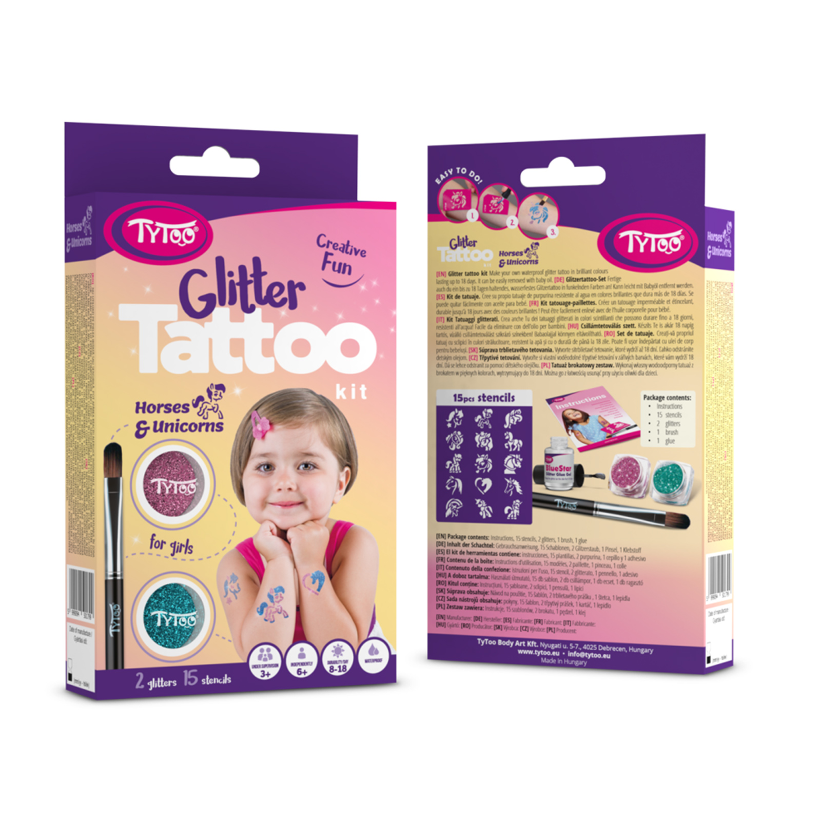 Puteți face 15 tatuaje cu sclipici strălucitoare pentru fetițe care durează săptămâni întregi, cu ușurință. În set veți găsi tot ce aveți nevoie pentru a face tatuaje. Conceput special pentru fetele cu vârsta cuprinsă între 3-12 ani, prezintă modele de cai, ponei și unicorn. Tatuajele cu sclipici TyToo pot fi folosite în siguranță și de către copii, deoarece conțin materiale cosmetice de calitate, care respectă reglementările UE. Aplicarea lui este simplă, chiar și un copil de 6 ani își poate face propriul tatuaj cu sclipici. În plus, își pot îmbunătăți abilitățile în timp ce creează. Setul este plin de șabloane de cal, ponei și unicorn, care au fost special concepute pentru brațele mici ale copilului tău. Așa că vă puteți face cu ușurință propriile mici tatuaje strălucitoare, dar să vă distrați împreună poate fi și mai distractiv pentru ei!