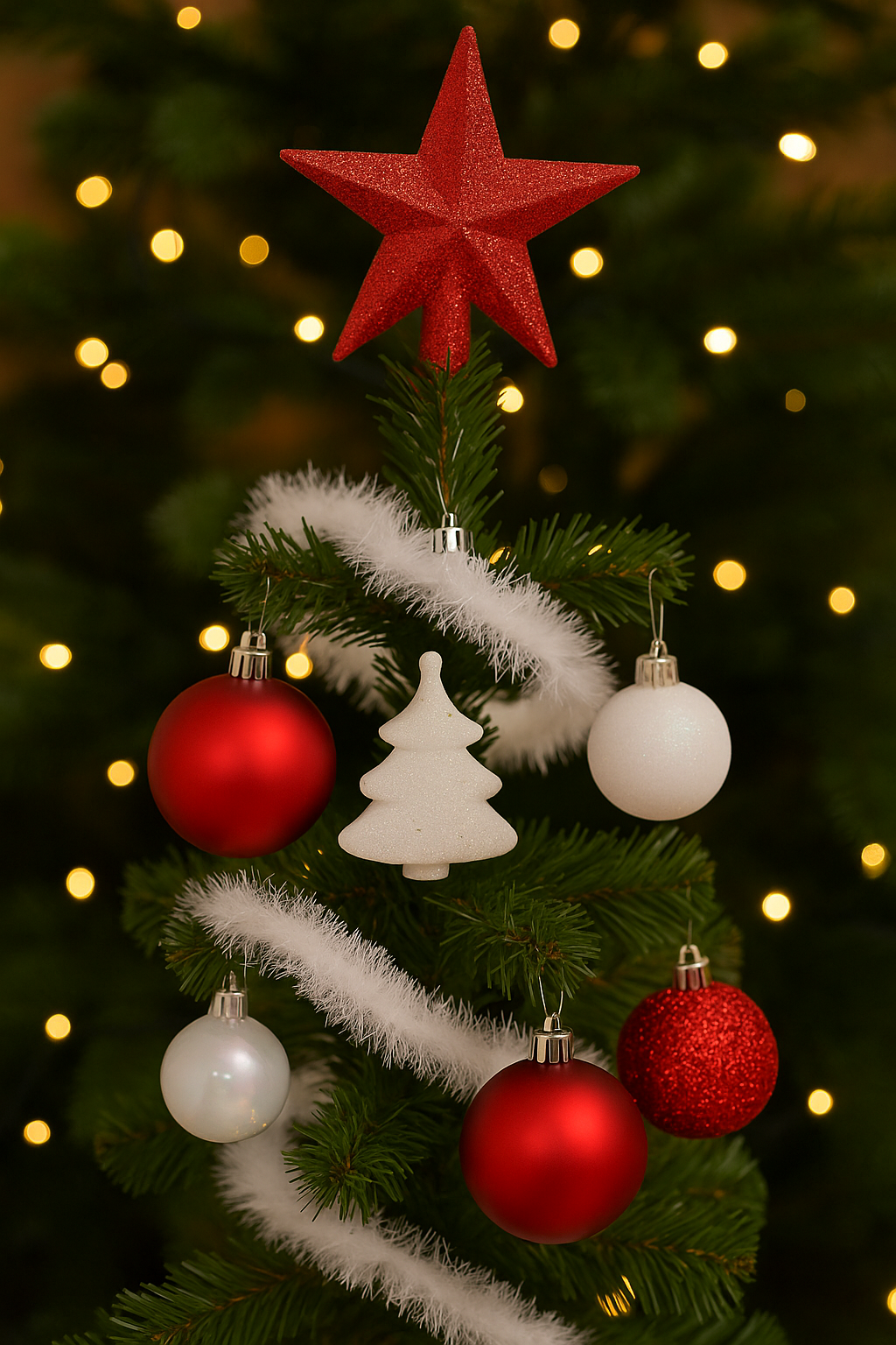 - Include globuri, ghirlandă, vârf și ornamente suspendate