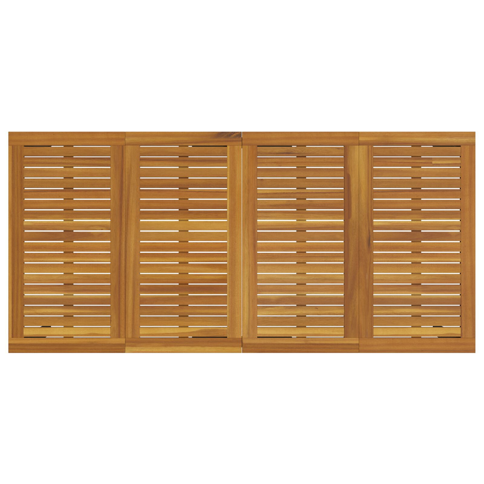 Setul ăsta mare de dining pentru grădină e o alegere elegantă și încăpătoare pentru mese în aer liber, perfect pentru întâlniri mai mari pe balcoane sau terase. Cu combinația stylish de metal negru și lemn tec, e creat pentru cei cu gust care vor să înfrumusețeze atmosfera de afară.