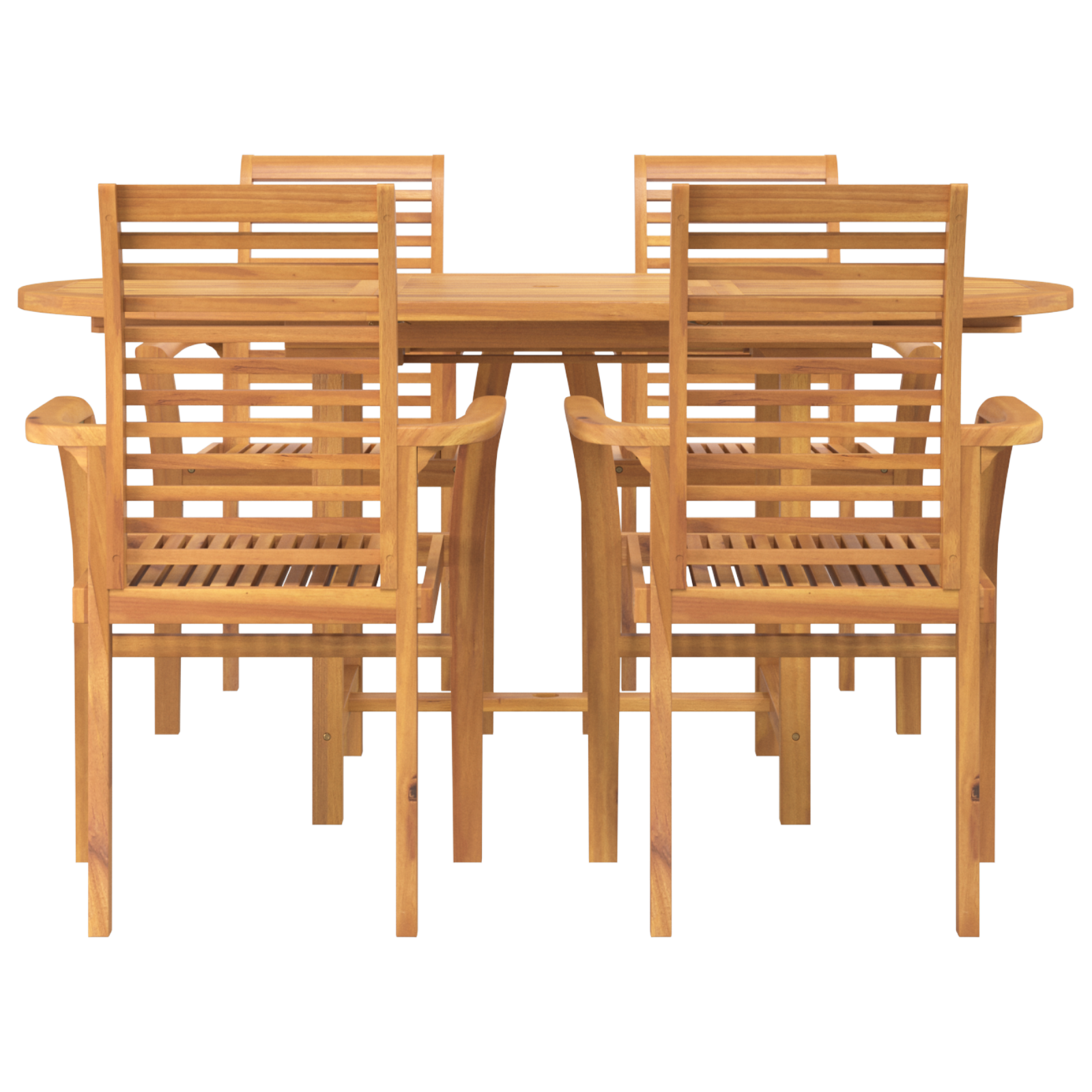 Acest set de dining pentru grădină cu 5 piese e despre lemnul solid de tec, perfect pentru cum îți place să organizezi mesele în aer liber. Forma ovală modernă potrivește perfect cu patru invitați, adăugând un pic de farmec la orice patio sau grădină.