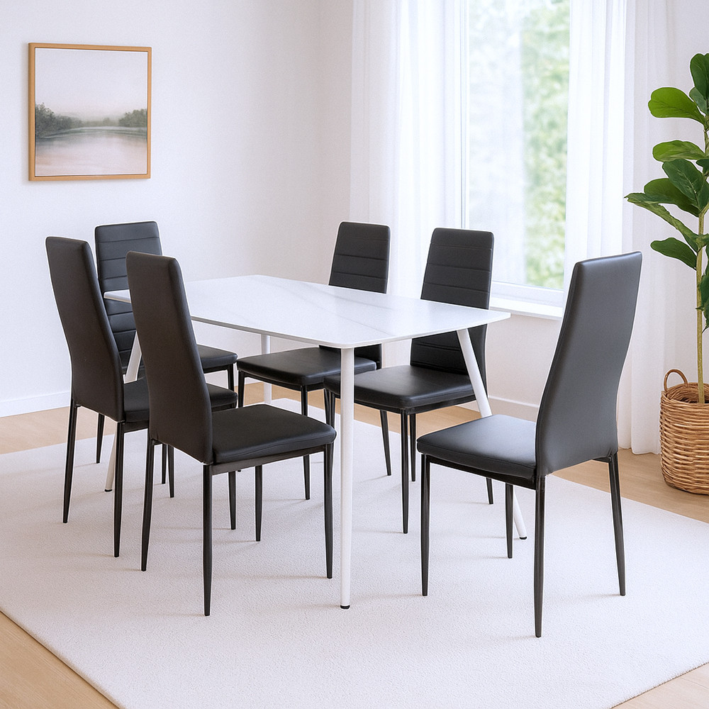 Transformă zona de luat masa într-un spațiu modern și primitor cu setul de dining Leziter Jenna 6+1, în contrast elegant alb-negru. Primești o masă Bora cu blat din piatră sinterizată (efect ardezie) și 6 scaune Tino NOVA negre, ușor de integrat în living sau bucătărie.