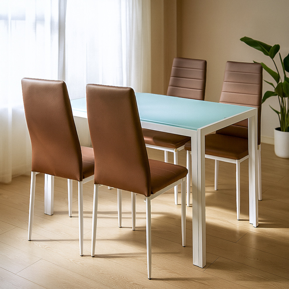 Transformă rapid zona de luat masa cu setul Leziter Portland 4+1: o combinație modernă, ușor de integrat în orice locuință, cu masă din sticlă securizată și 4 scaune maro confortabile. Designul aerisit și picioarele metalice albe oferă un plus de lumină, iar materialele sunt gândite pentru utilizare zilnică și întreținere simplă.