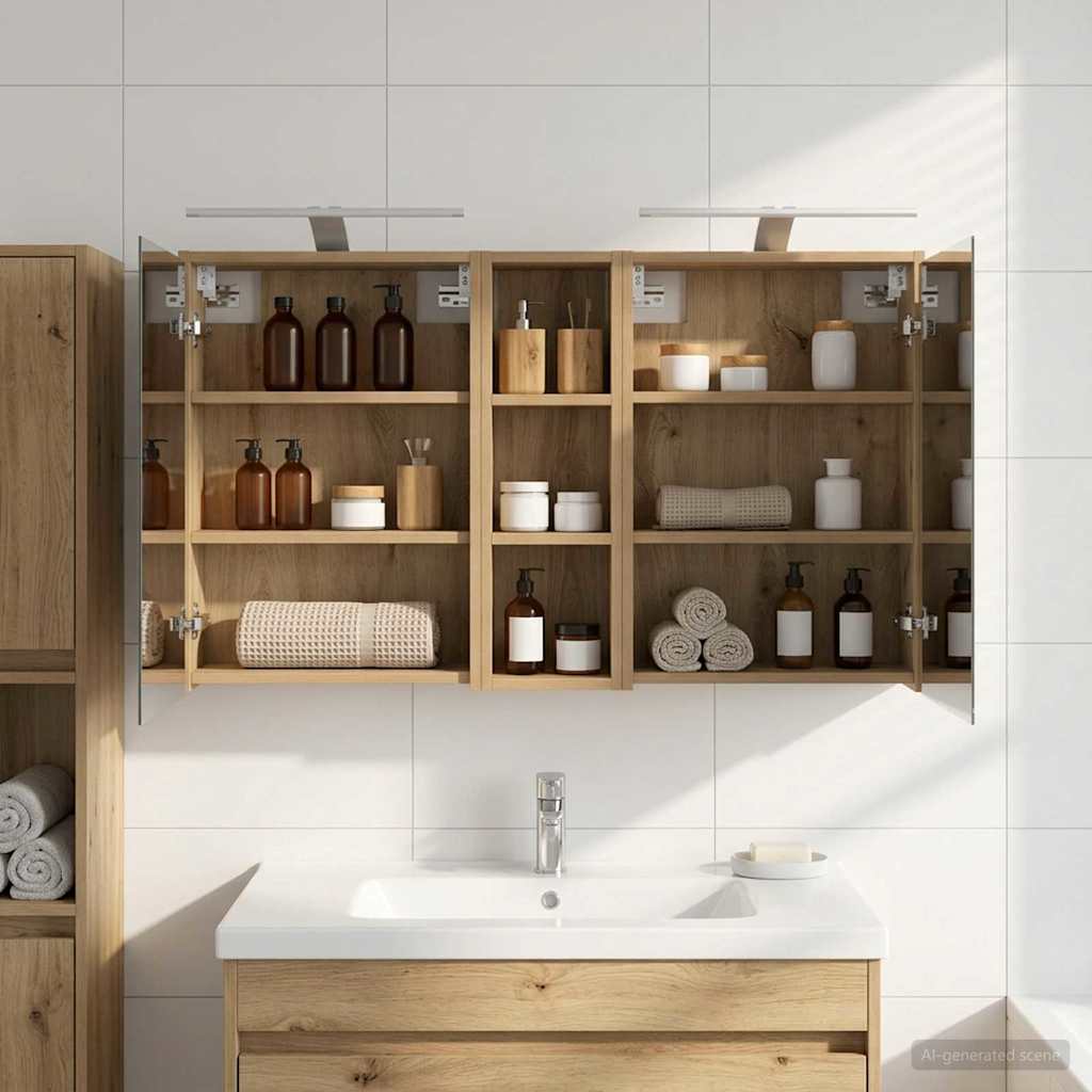 Setul ăsta de cabine de baie aduce o soluție elegantă și practică pentru băile geamănice. Cu lemn prelucrat și linii curate, cabinetul are o oglindă bidirecțională care face spațiul să pară mai mare și adaugă un pic de intrigă. E perfect pentru proprietari și designeri care caută o stocare eficientă, dar și un design minimalist care dă o notă de fresh oricărei băi, cu iluminat LED care îmbină funcția cu stilul.