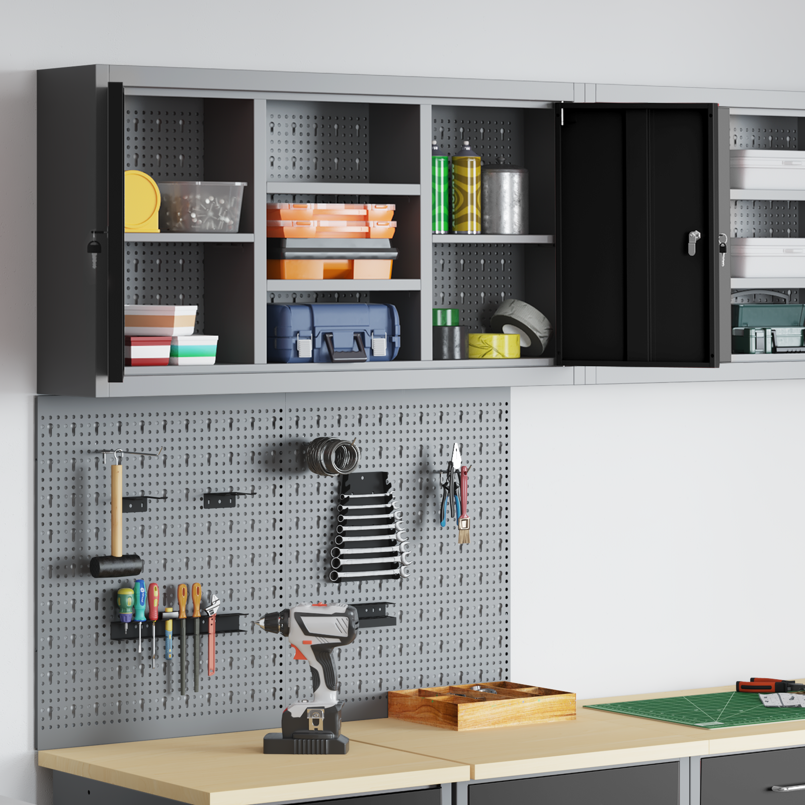 - Organizare Versatilă: Cu două pegboard-uri și mulți cârlige, uneltele tale sunt ușor de văzut și accesibile.