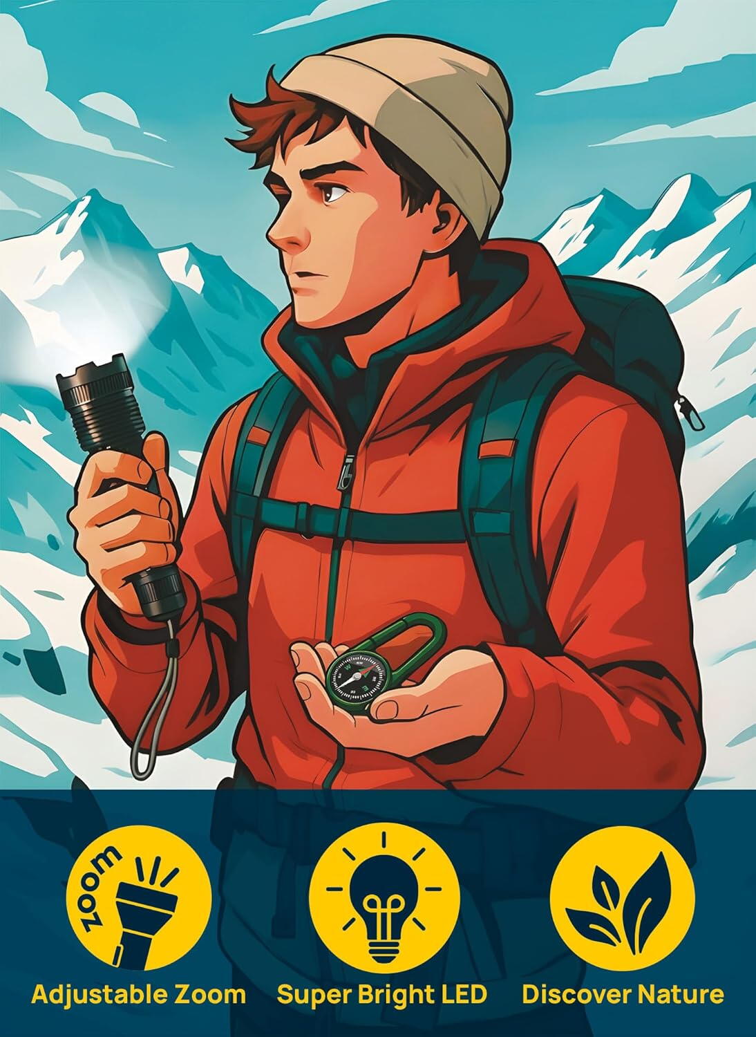 Mod de utilizare: Setul poate fi folosit in plimbari, excursii, tabere sau activitati educative in aer liber. Copilul poate ilumina traseul cu lanterna si isi poate exersa orientarea cu ajutorul busolei, dezvoltandu-si increderea si autonomia in timpul explorarii.