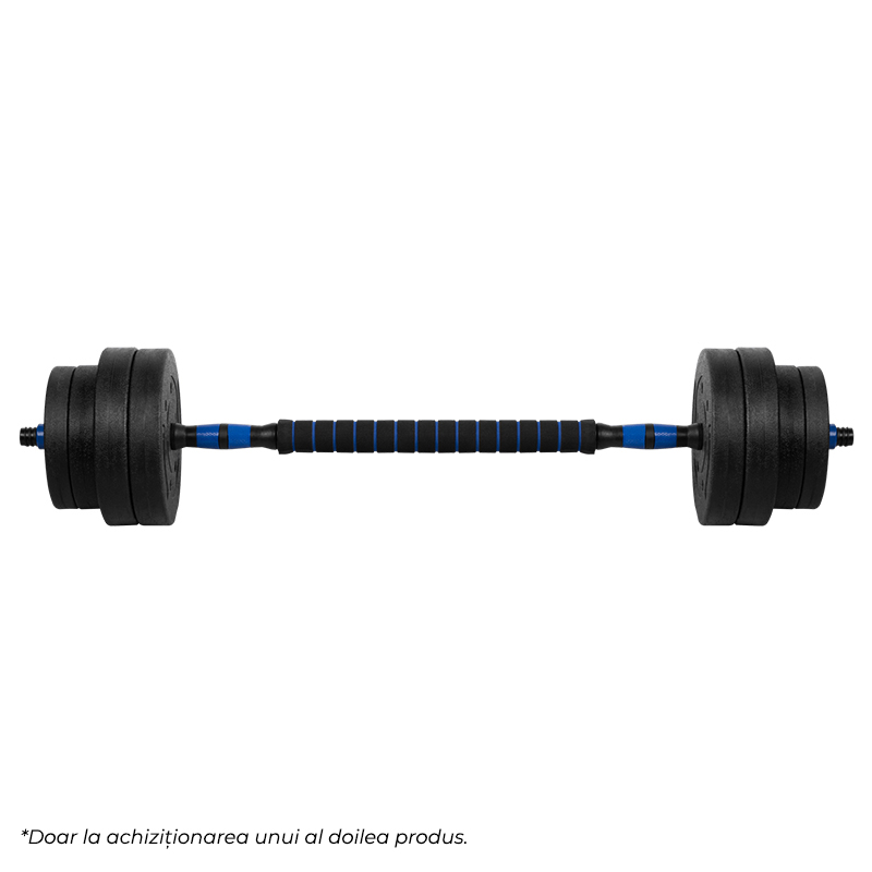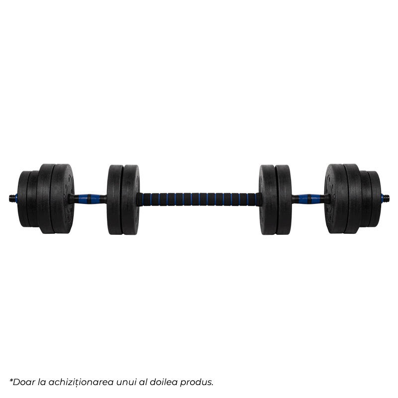 Utilizare: montează discurile pe bară, fixează-le cu piulițele și alege greutatea potrivită. Pentru exerciții tip halteră, atașează conectorul între cele două gantere și verifică strângerea înainte de antrenament.