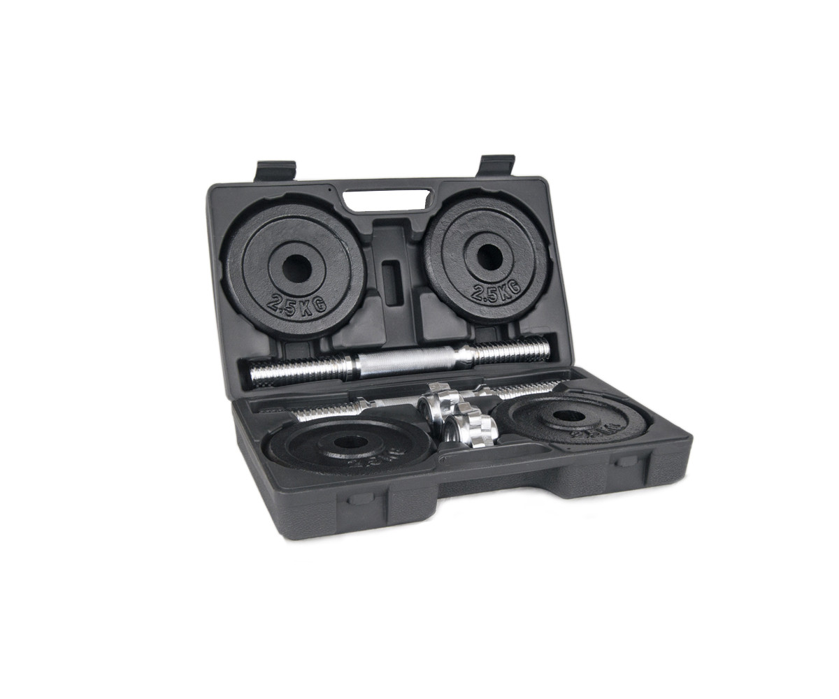 Setul de gantere reglabile 2x10 kg de la Sportmann este fabricat din fier de calitate superioara, pentru rezistenta indelungata la utilizare. Bara cu finisaj cromat este prevazuta cu filet la ambele capete, pentru a fixa mai bine sigurantele. Discurile din fier prezinta rezistenta crescuta la uzura si au diametrul gaurii de 31 mm. Barele au o lungime de 35 cm si au diametrul de 30 mm. Setul este format din 4 discuri de 2.5 kg, 4 discuri de 1.25 kg, 2 bare cromate, 4 sigurante cu filet. Toate acestea sunt incluse intr-un diplomat practic, cu ajutorul caruia puteti transporta setul foarte usor oriunde aveti nevoie.